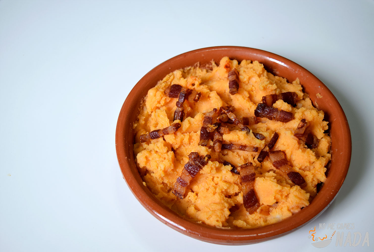 Servimos las patatas revolconas en una cazuela de barro al estilo tradicional y ponemos por encima los “torreznos” caseros que hemos hecho.