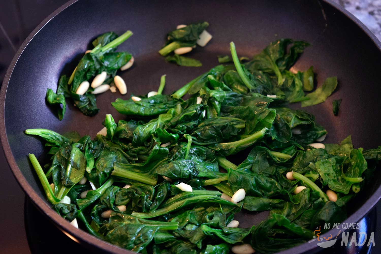 Pelamos y picamos muy finitos los dientes de ajo y los ponemos a dorar en la sartén con un chorrito de aceite de oliva virgen extra, junto con los piñones. Cuando estos últimos empecen a tostarse, incorporaremos las espinacas troceadas y saltearemos durante unos minutos. A mí me gusta utilizar espinacas frescas, pero podéis usar espinacas congeladas troceadas perfectamente.