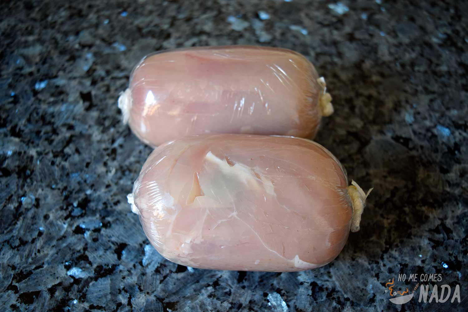 Necesitaremos las pechugas abiertas en libro, obteniendo así un solo filete de poco grosor de cada pechuga. Lo más fácil es pedirle al carnicero que os lo haga cuando las compréis, pero si sois habilidosos con el cuchillo, lo tenéis muy fácil.