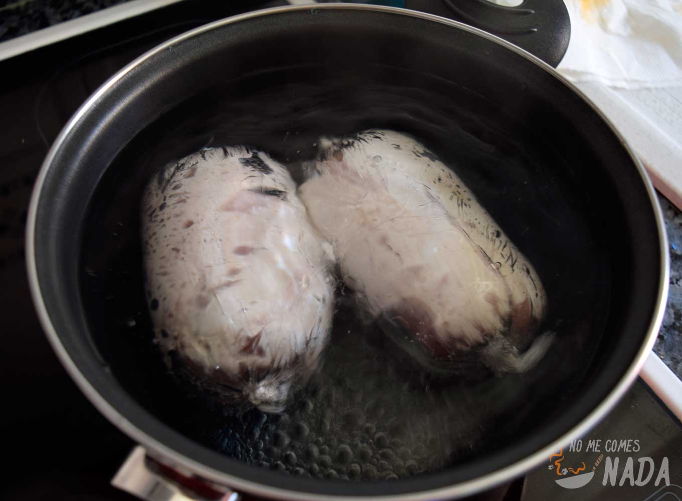Ponemos una olla con abundante agua a fuego fuerte y, cuando rompa a hervir, echamos los rollos de pollo y los dejamos cocer durante unos 15 minutos aproximadamente. Aquí una advertencia importante, tened cuidado que los rollos no se peguen al fondo (se hunden si pesan mucho) porque puede darse el caso de que el film se derrita con el calor y se quede pegado al fondo de la olla…lo digo por experiencia propia… Una vez cocidos, los sacamos, los escurrimos y dejamos que se atemperen un poco.