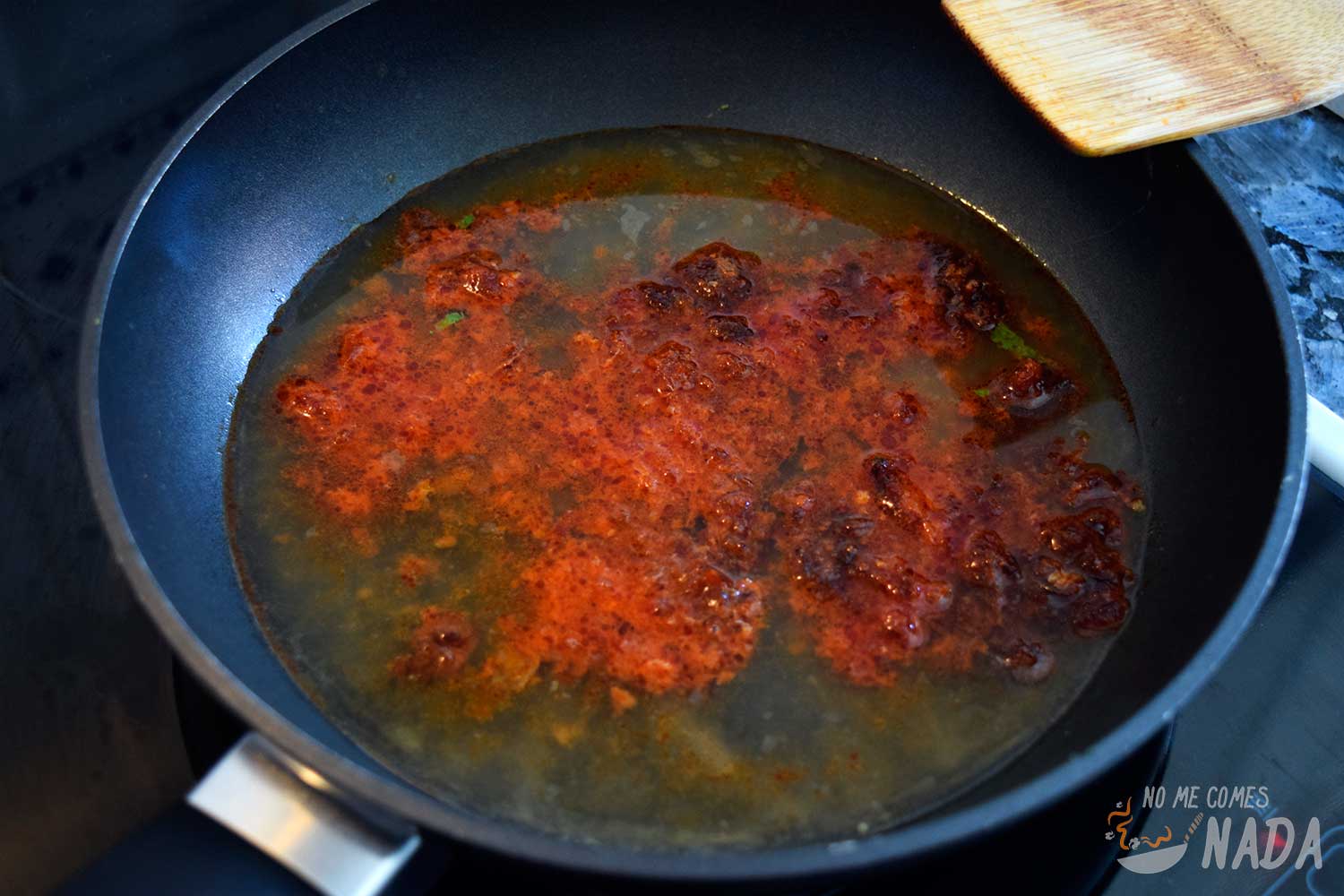 Mientras se enfrían las pechugas, vamos a preparar la salsa con la que los acompañaremos. Ponemos la sobrasada que nos queda (un tercio, 40g) junto con el agua que habían soltado las espinacas y salteamos un poco para que se desmenuce la sobrasada. Incorporamos el vino blanco y dejamos que hierva unos minutos. Añadimos el agua y dejamos cocer durante unos 5 minutos.