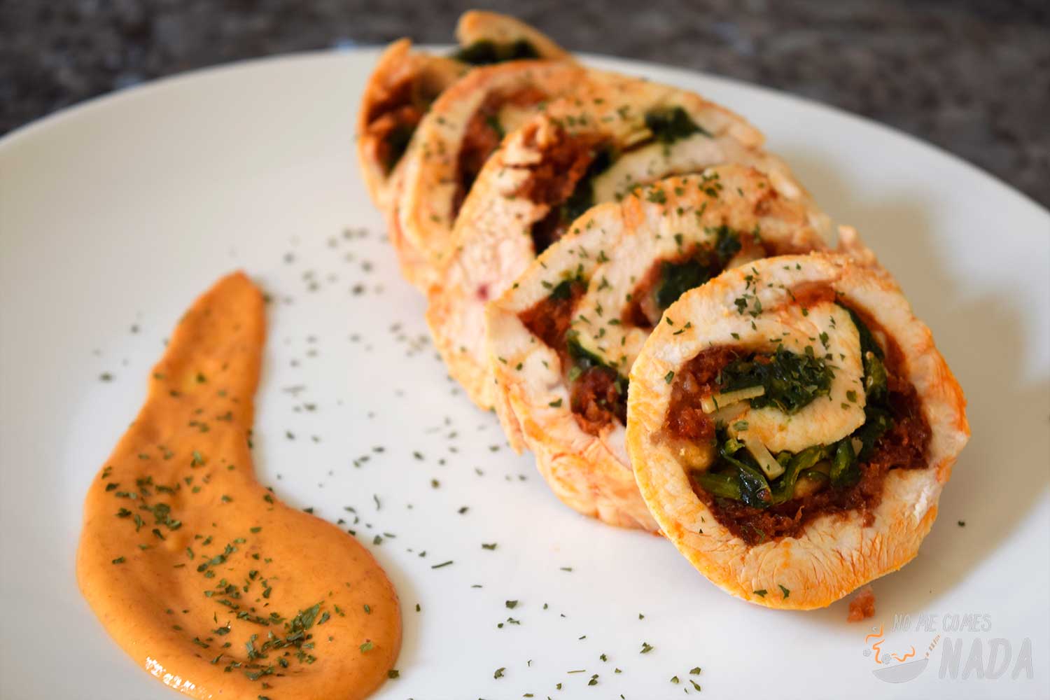 Una vez todo listo, cortamos los rollos de pechuga en rodajas de un grosor medio y la acompañamos con la salsa que acabamos de preparar.