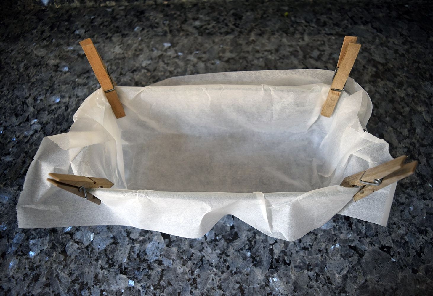 Truco: para que os resulte más fácil forrar el molde podéis utilizar unas pinzas de tender para aguantar el papel a los bordes del molde para que no se mueva a la hora de verter el contenido