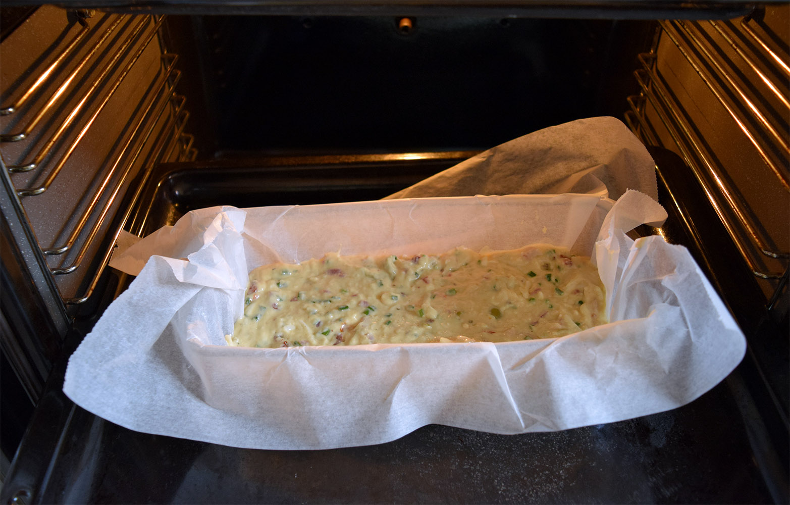 Una vez que tenemos la masa, cogemos un molde apto para horno y lo forramos con papel vegetal/sulfurizado para que no se nos pegue y sea fácil desmoldarlo.