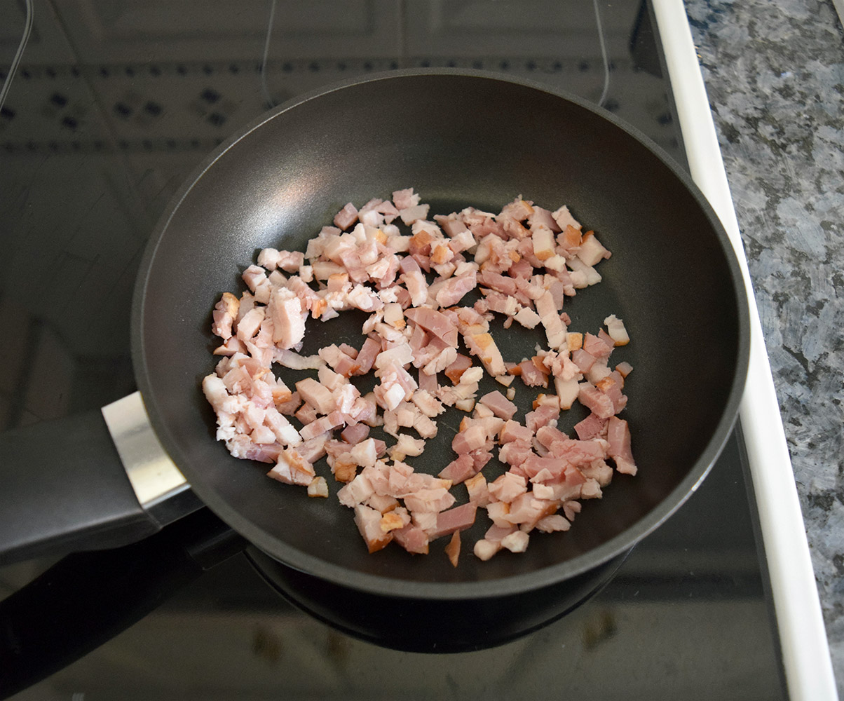 Empezaremos por el bacón, picándolo lo más pequeñito que podamos porque, aunque ya viene troceado, estos son bastante grandes para echarlos tal cual. Una vez bien troceados, ponemos una sartén a fuego fuerte y los freímos hasta que empiece a dorarse. No es necesario que echéis aceite porque el bacón soltará su propia grasa.