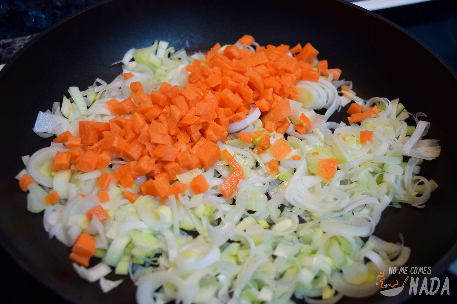 Empezaremos pochando las verduras. Para ello, le quitamos la parte verde al puerro junto con las raíces de abajo y la primera capa. Cortamos el puerro a lo largo, hasta la mitad, en forma de cruz para poder limpiarlo bien poniéndolo bajo el grifo. Lo picamos finamente y lo ponemos en una sartén a fuego medio-bajo con un chorro generoso de aceite de oliva virgen extra.