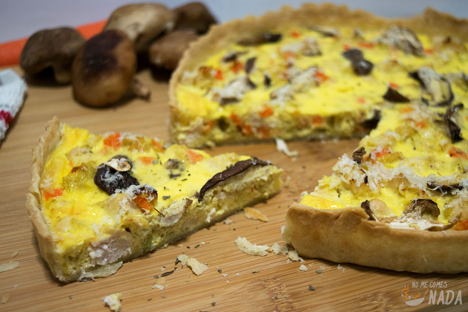 Tras esos 10 minutos, sacamos la masa del horno y vertemos lo que habíamos preparado en la sartén (puerro, zanahoria y pollo) y añadimos, también, las setas shiitake laminadas. Batimos los huevos con la nata y lo vertemos sobre el relleno, procurando que quede bien repartido y sin que llegue a rebosar por los bordes.