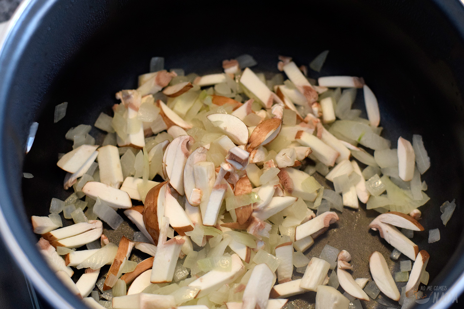 En caso de que hagáis como yo y añadáis unos cuantos champiñones, los cortamos y los añadimos junto con la cebolla.