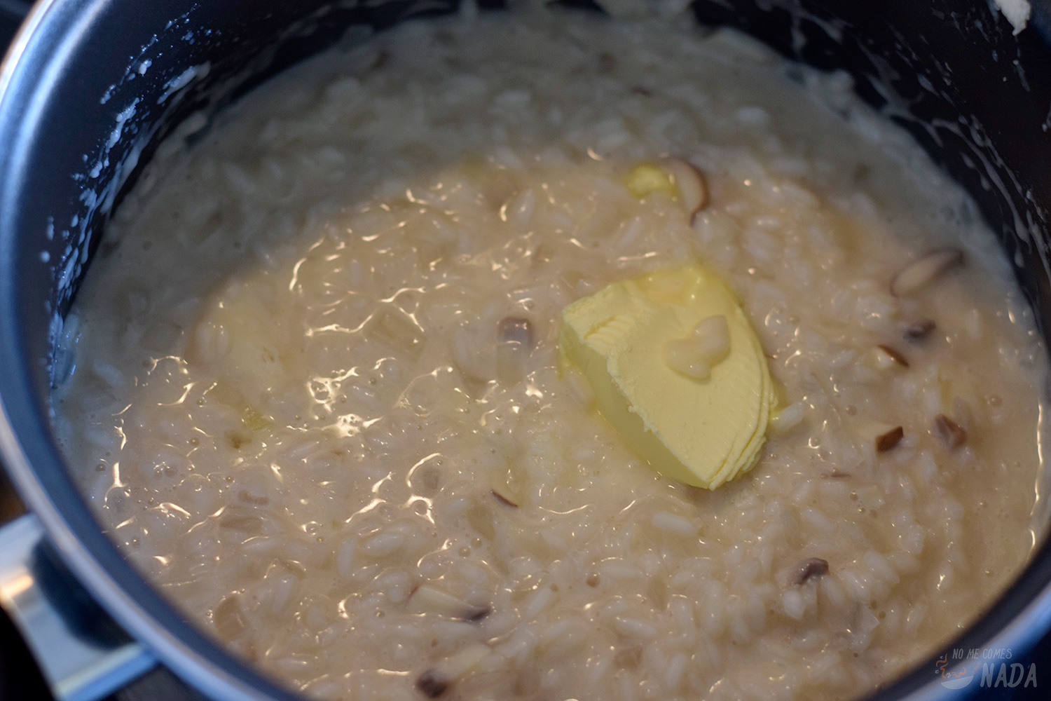 Una vez que tengamos el arroz cocido, retiramos la cazuela del fuego y procedemos a mantecar el risotto. Para ello simplemente tenemos que añadir una nuez de mantequilla y el queso parmesano rallado. Mezclamos para que se integren en el risotto y dejamos reposar, tapado, durante 5 minutos.