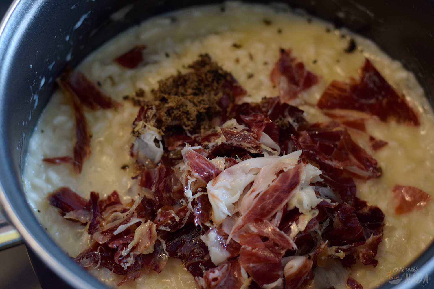 Una vez haya reposado, añadiremos el jamón serrano troceado y la trufa rallada. La cantidad de trufa es un poco al gusto, en mi caso usé media (tened en cuenta que es trufa de supermercado, no tendrá mucha calidad). Mezclamos para repartir los ingredientes.