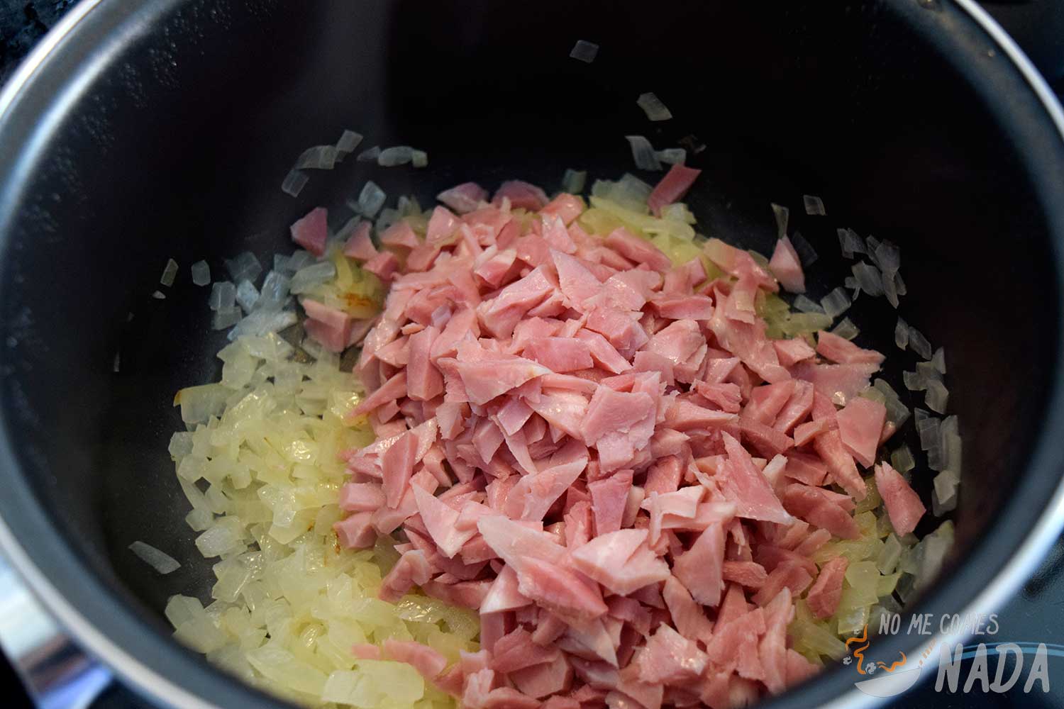 Por otro lado, pelamos y picamos finamente la cebolla. La ponemos a fuego medio-bajo en una cazuela con un chorreón generoso de aceite de oliva virgen extra y la dejamos que se poche hasta que esté blanda y empiece a transparentarse.