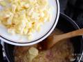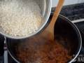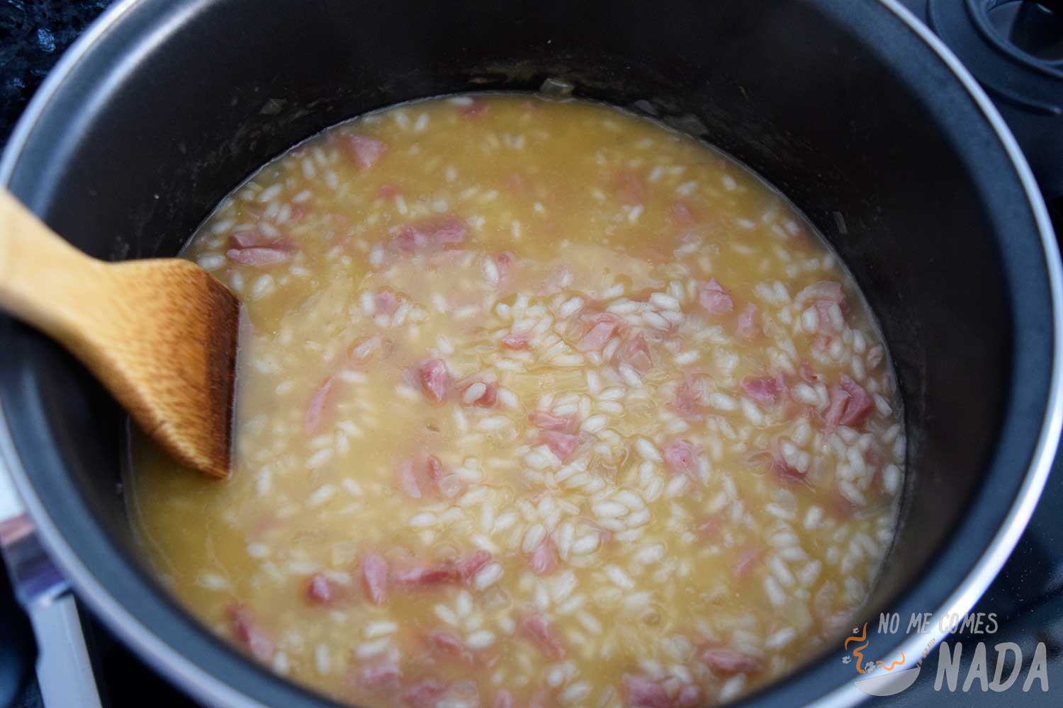 Y, como siempre digo en las demás recetas de risotto, llega la parte tediosa de hacer pero que es el punto clave para obtener un buen risotto cremoso: la cocción. Añadiremos el caldo que tenemos caliente hasta cubrir ligeramente el arroz y nos tocará remover lenta pero constantemente para que el arroz se vaya cociendo suavemente mientras va soltando el almidón. Cuando veamos que se consume un poco de caldo, volvemos a añadir hasta cubrir de nuevo el arroz. Repetimos el proceso hasta que el arroz esté en su punto, unos 16-18 minutos. La cantidad de caldo puede variar ligeramente dependiendo de cuánto absorba el arroz.