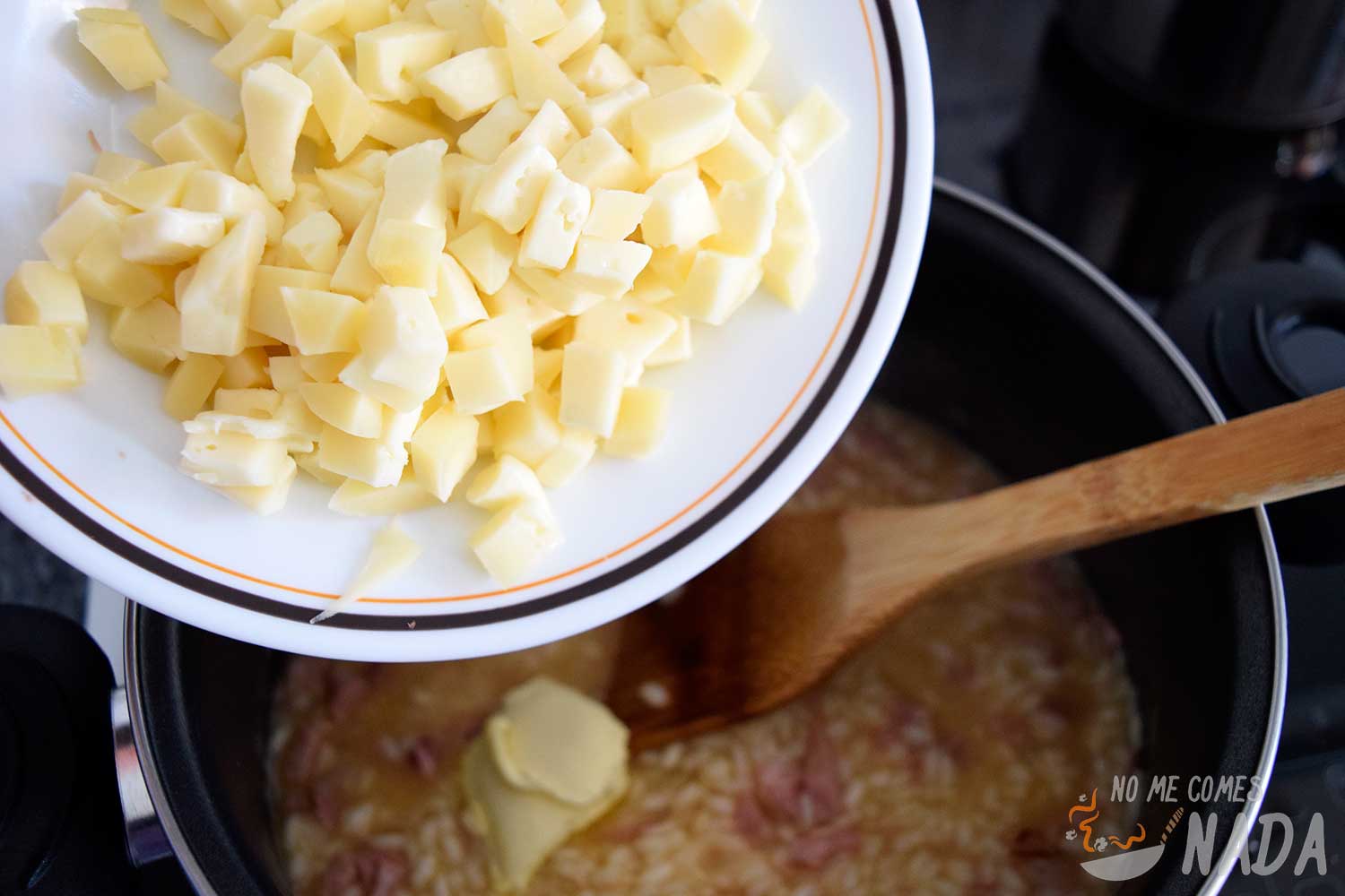 Cuando tengamos el arroz listo, retiramos la cazuela del fuego y añadimos una nuez de mantequilla y el queso Arzúa-Ulloa. Removemos hasta que estén totalmente integrados estos ingredientes y dejamos reposar tapado durante unos 5 minutos. Con esto conseguiremos “mantecar” el risotto, es decir, conseguir un risotto muy muy cremoso.
