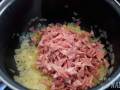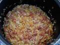 En ese momento añadimos el lacón troceado y el pimentón. Subimos un poco el fuego y salteamos unos minutos. Agregamos el arroz a la cazuela y dejamos un par de minutos, removiendo hasta que los granos empiecen a transparentarse por el exterior. Vertemos el vino blanco y dejamos el tiempo justo para que se evapore el alcohol.