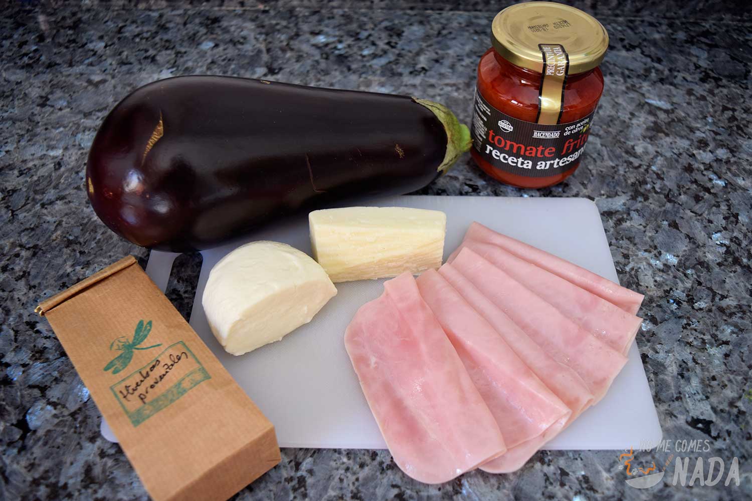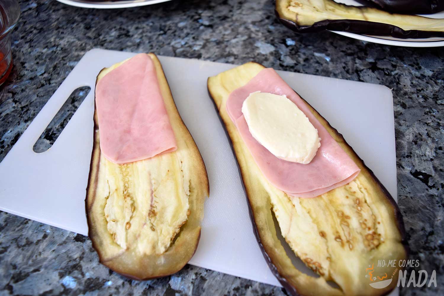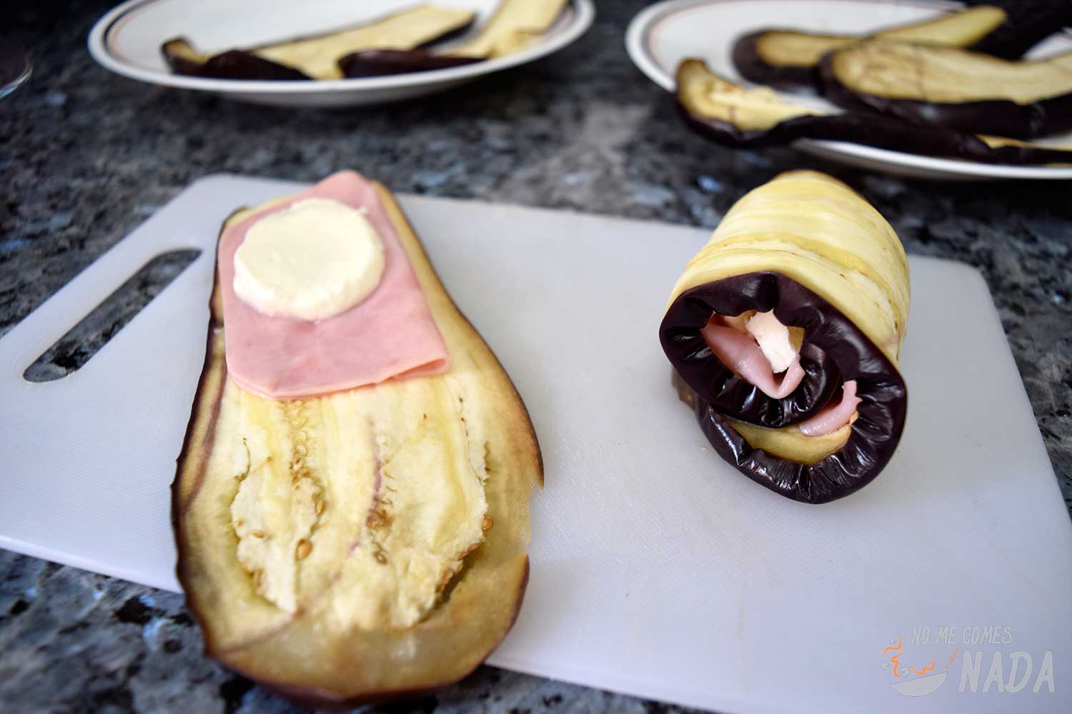 Vamos con el montaje de los rollitos. Para ello, colocamos una loncha de berenjena y sobre ella una de jamón cocido y una de queso mozzarella. Podéis usar el queso que más os guste, mientras funda bien. En mi caso usé mozzarella fresca y añadí también un poco de queso de cabra que tenía sobrante (aunque no aparece en las fotos). Enrollamos todo y dejamos el cierra hacia abajo.