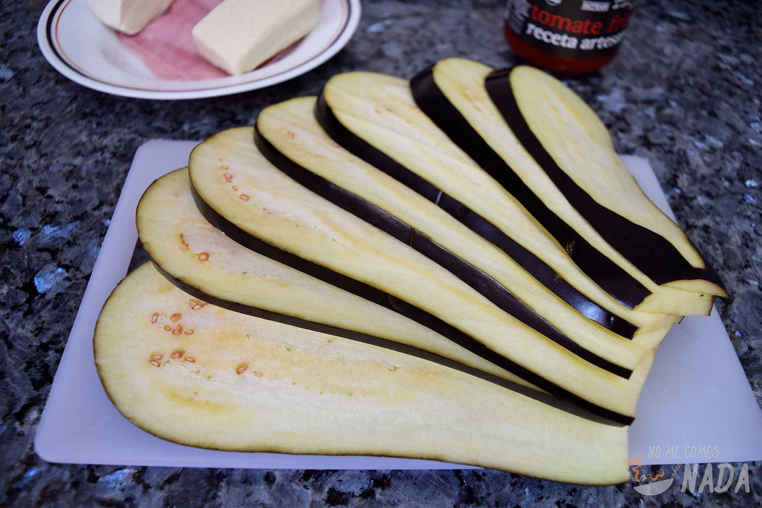 Lavamos bien la berenjena porque no le vamos a quitar la piel. Le quitamos la parte superior y vamos haciendo cortes longitudinalmente, sacando lonchas de un grosor que podéis apreciar las fotos. Desecharemos la primera y la última loncha que tendrá más pinta de tapa de pan de molde ![]()