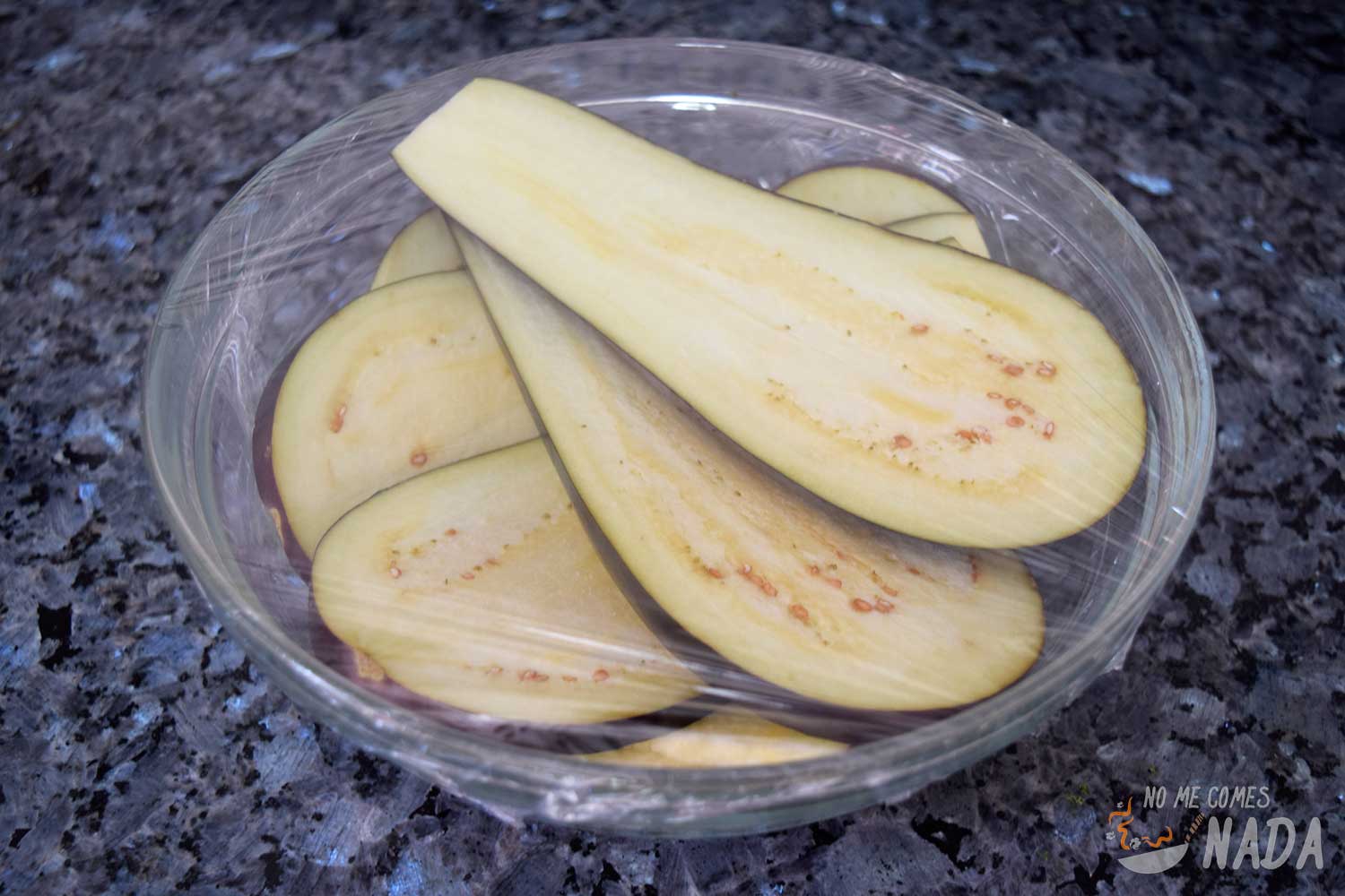 Salamos un poco cada loncha de berenjena y las ponemos en un bol apto para microondas. Tapamos el bol con film transparente y lo metemos al micro a máxima potencia durante unos 6-8 minutos. Una vez cocidas, retiramos el film con cuidado de no quemarnos con el vapor que salga del bol y dejamos templar las lonchas.