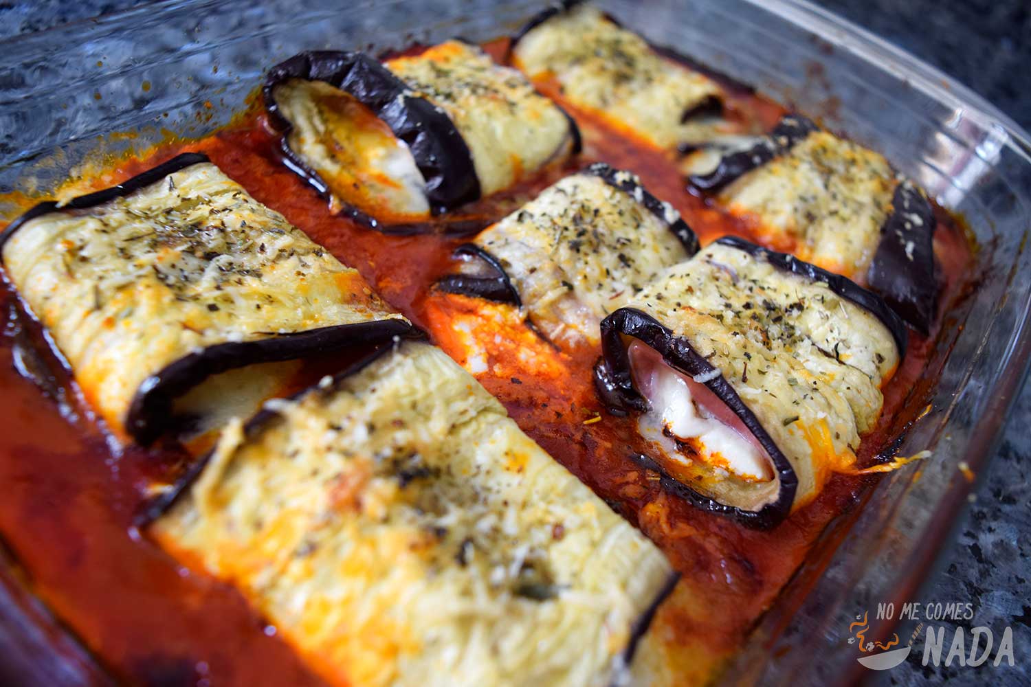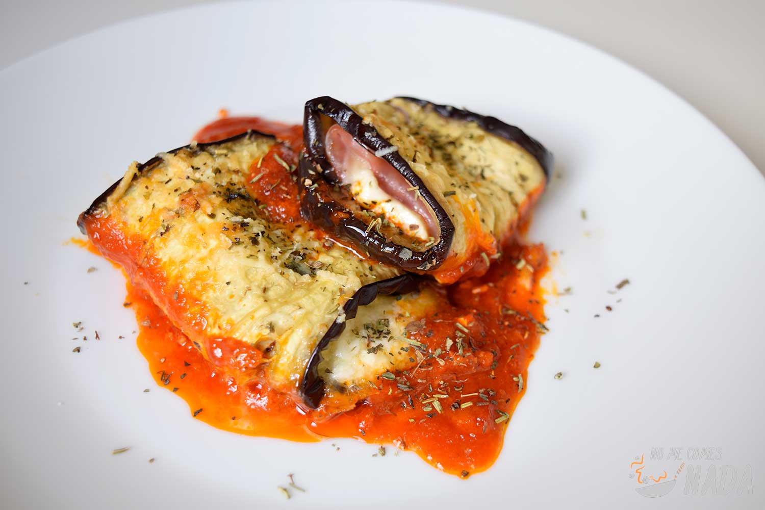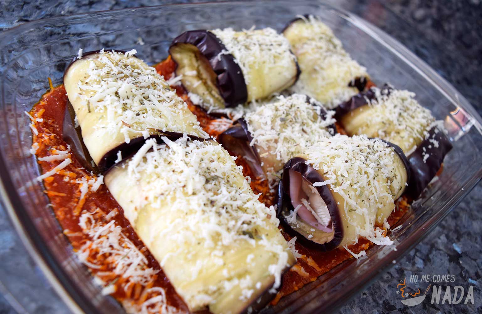 En una fuente apta para horno, ponemos en el fondo una capa de salsa de tomate y vamos colocamos todos los rollitos de berenjena. Espolvoreamos por encima un poco de queso parmesano rallado y un poco de orégano o hierbas provenzales.