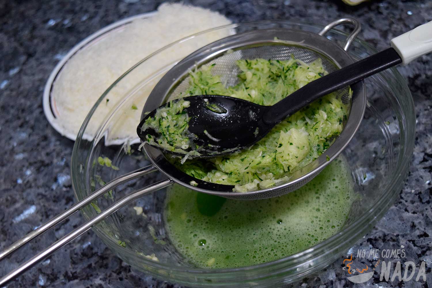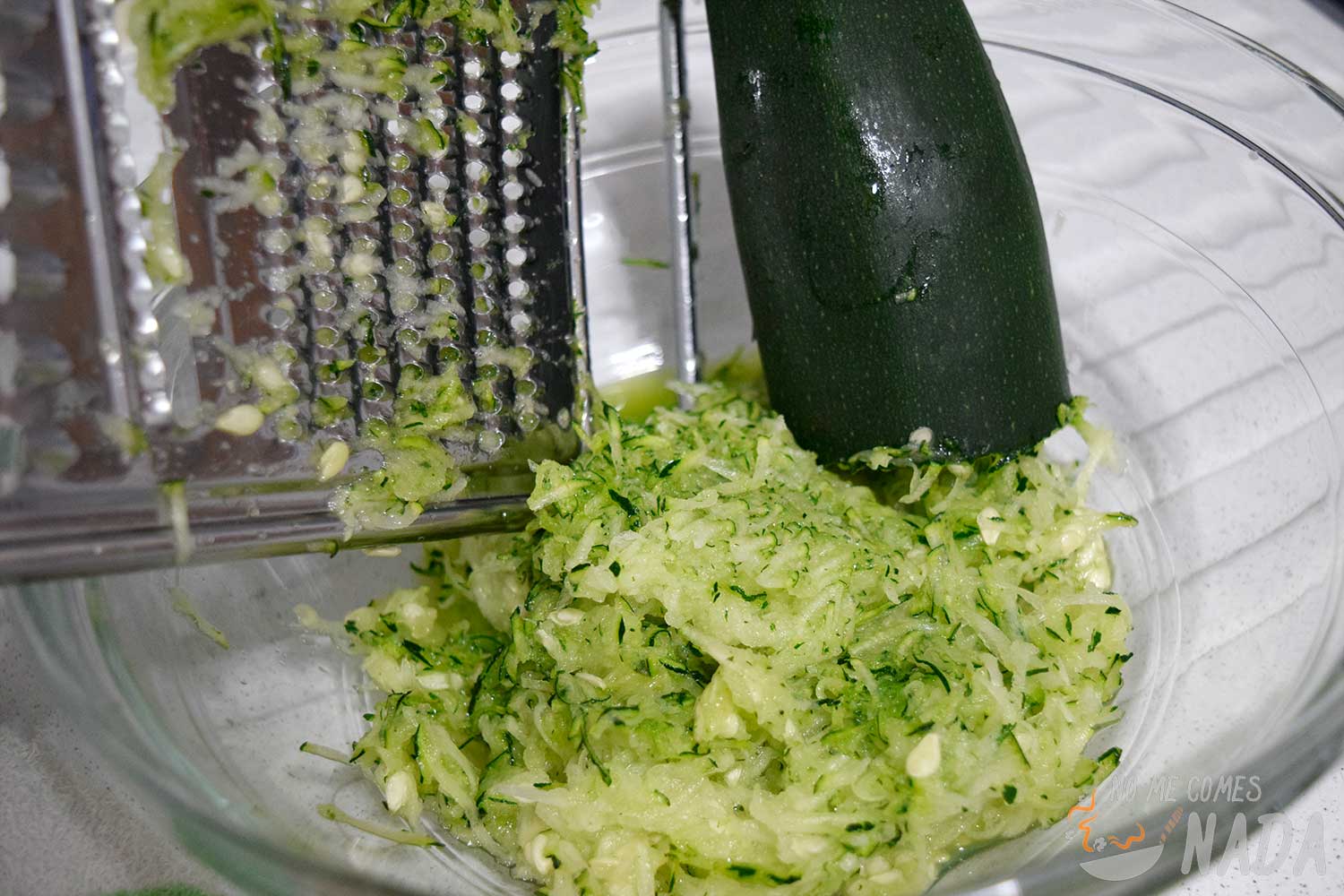 Lavamos bien el calabacín porque lo utilizaremos con la piel. Lo rallamos entero y lo dejamos sobre un colador durante unos 15 minutos para que suelte agua y quede lo más seco posible. Podéis remover de vez en cuando y apretar para exprimir más agua.