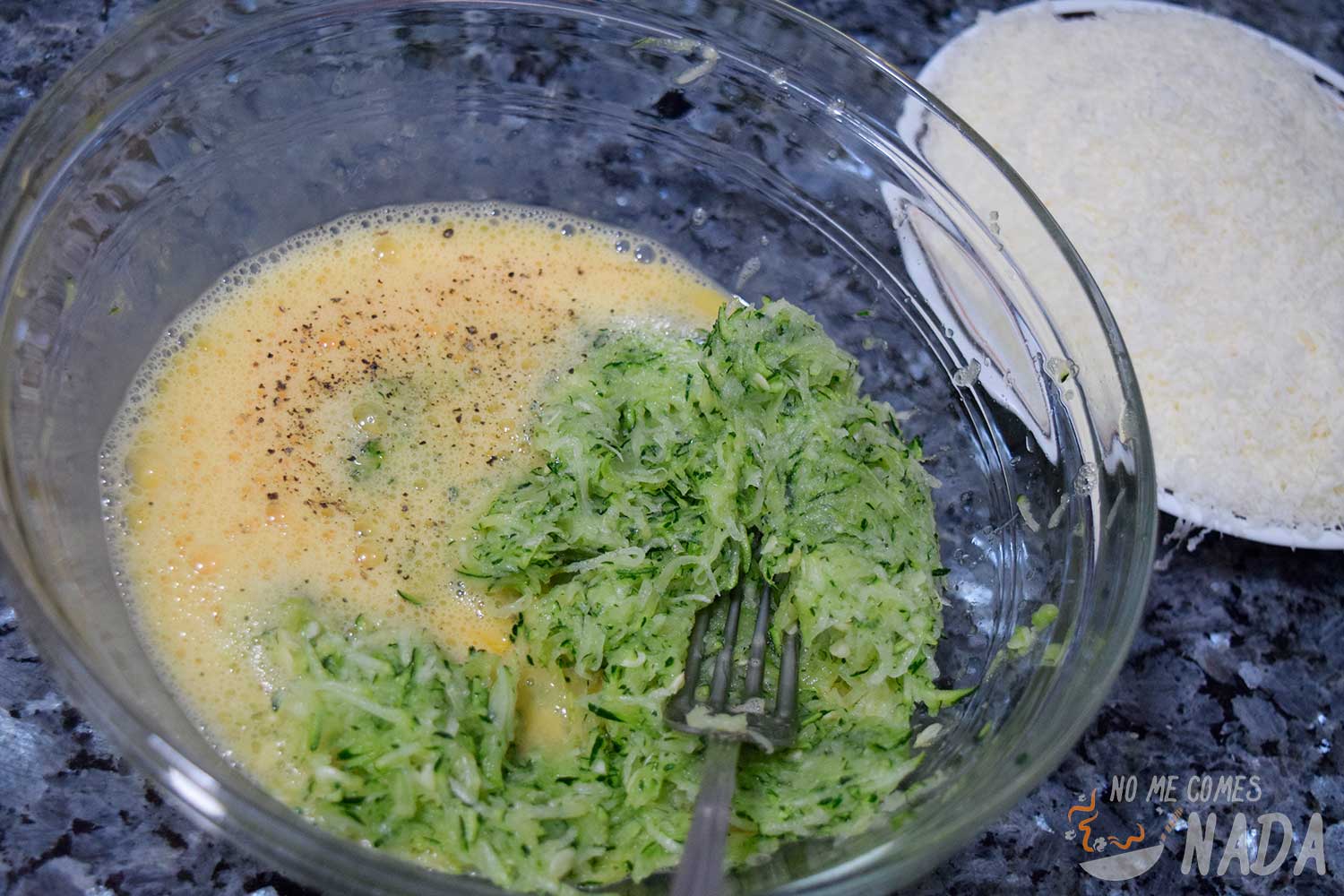 En un bol, batimos los huevos, salpimentamos y añadimos el calabacín junto con el queso parmesano rallado. Mezclamos hasta obtener una masa homogénea. No os he puesto la cantidad de queso porque va un poco al gusto de cada uno, si queréis que la masa más o menos a queso :)