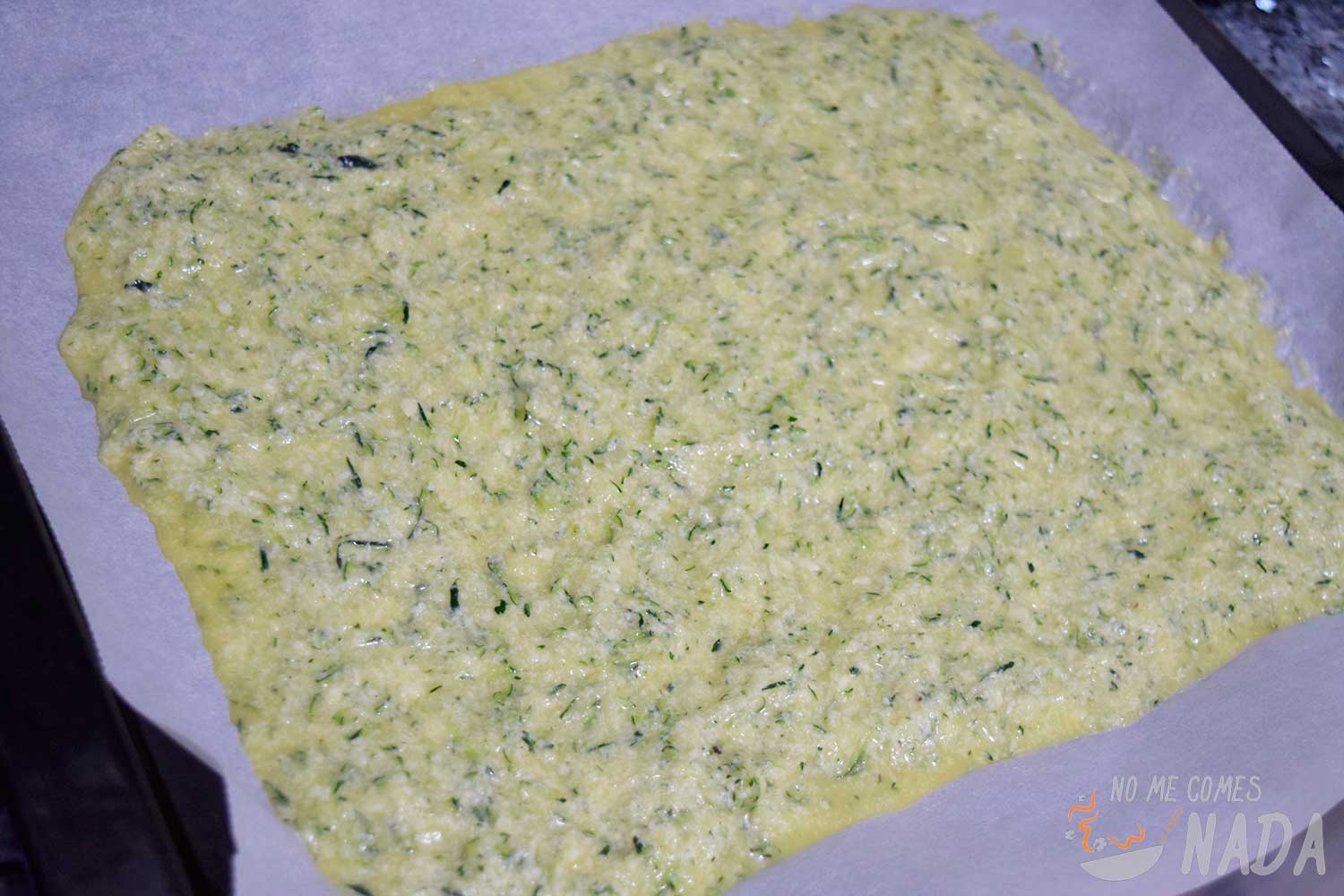 Cubrimos la bandeja del horno con papel vegetal, vertemos la masa del rollo de calabacín y la extendemos por casi toda la superficie, prestando atención a repartir la misma cantidad de masa por toda la superficie.
