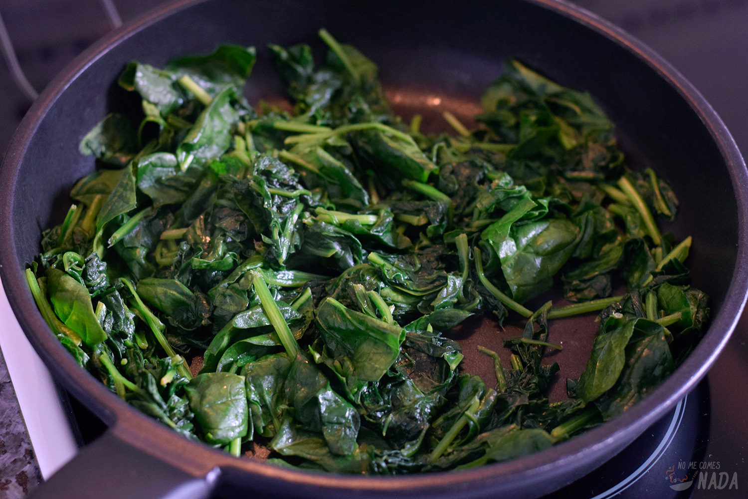 Mientras tanto, vamos a preparar el relleno de los rollos. Ponemos una sartén a fuego medio y añadimos un chorrito de aceite de oliva virgen extra. Cuando esté caliente, añadimos las espinacas y cocinamos hasta que reduzcan (que lo harán mucho). Cuando estén listas, retiramos del fuego y dejamos que atemperen.
