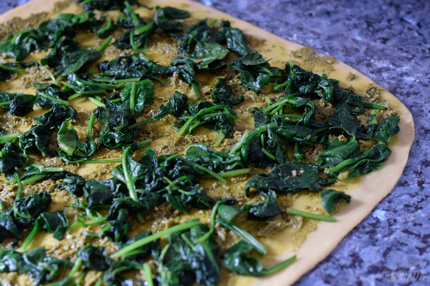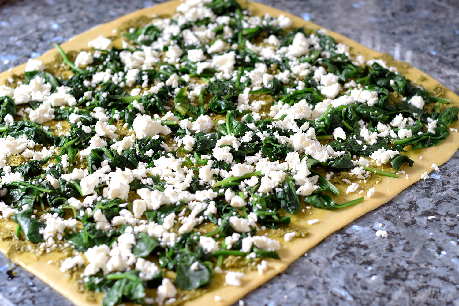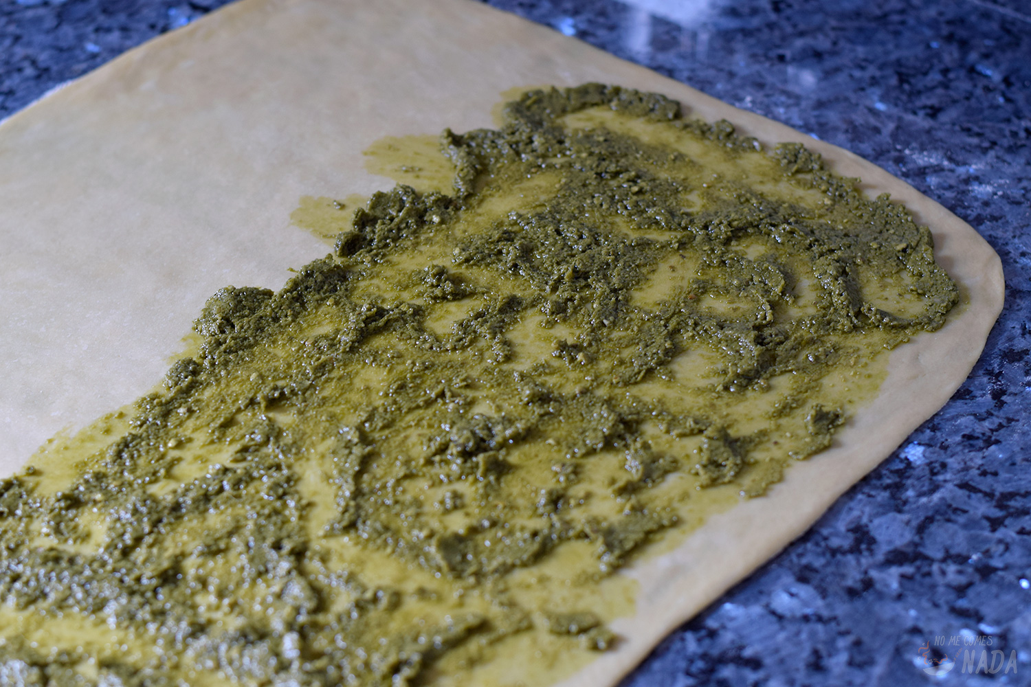 Con la masa y las espinacas listas, vamos a preparar los rollos. Enharinamos ligeramente la encimera y estiramos la masa, formando un rectángulo, hasta que tenga como medio dedo de grosor. Untamos toda la superficie de la masa con pesto, repartimos las espinacas por encima y hacemos lo mismo con el queso feta troceado.