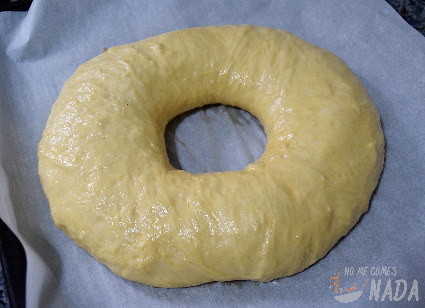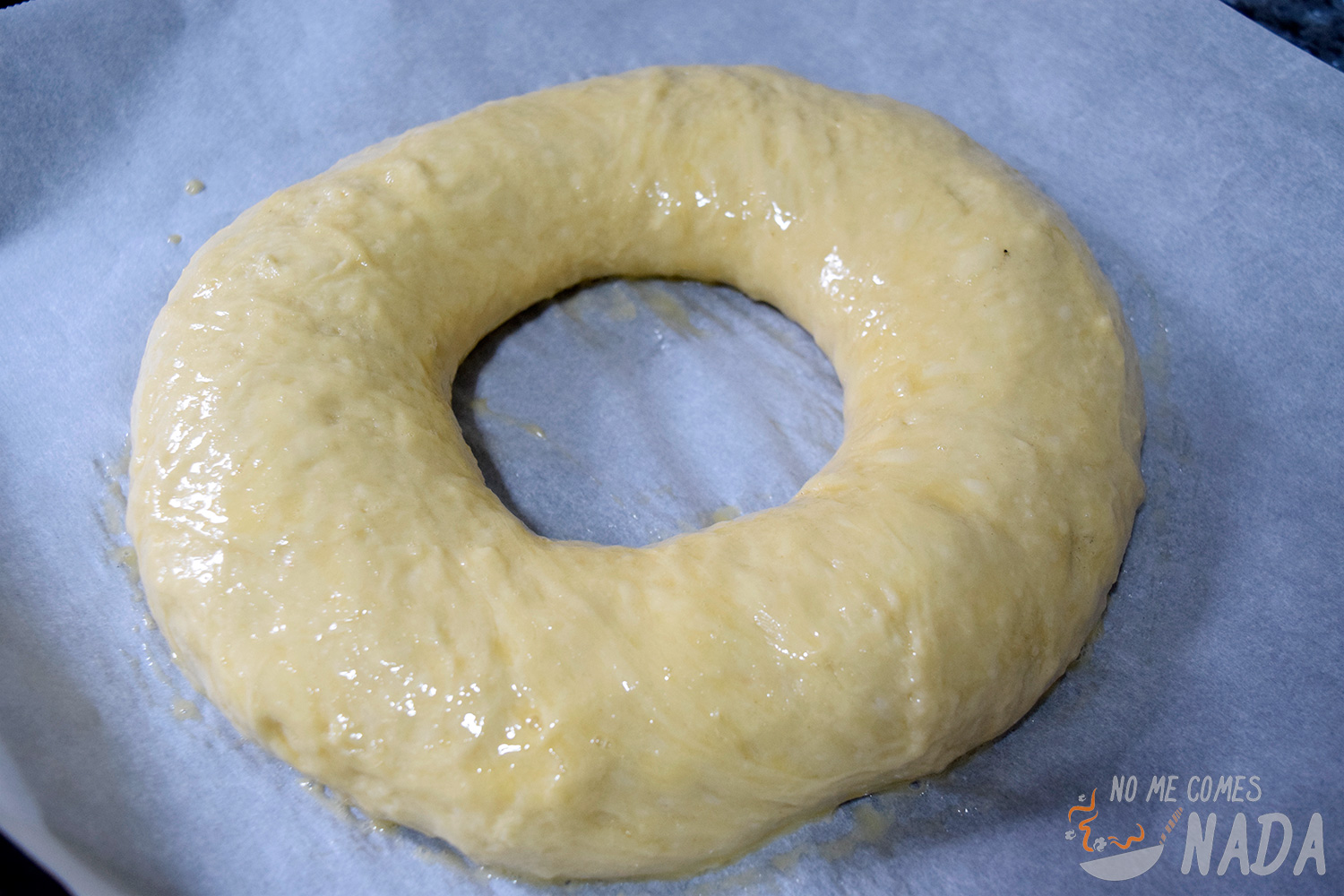 Hundimos un par de dedos en el centro de la masa hasta tocar la encimera y poco a poco vamos haciendo el agujero más grande. Cuando podamos meter las dos manos por el agujero, levantamos la masa y vamos girándola somo si estuviéramos tirando de una cuerda. Por el propio peso de la masa, se irá estirando. Cuando tengamos la forma deseada, colocamos el roscón de Reyes sobre papel de horno (si os cuesta mucho dar la forma, podéis dejarlo reposar 5 minutos y volver a estirarlo, la masa estará relajada y será más fácil). Pintamos muy bien la masa con huevo batido y dejamos que doble su volumen, durante una hora u hora y media.