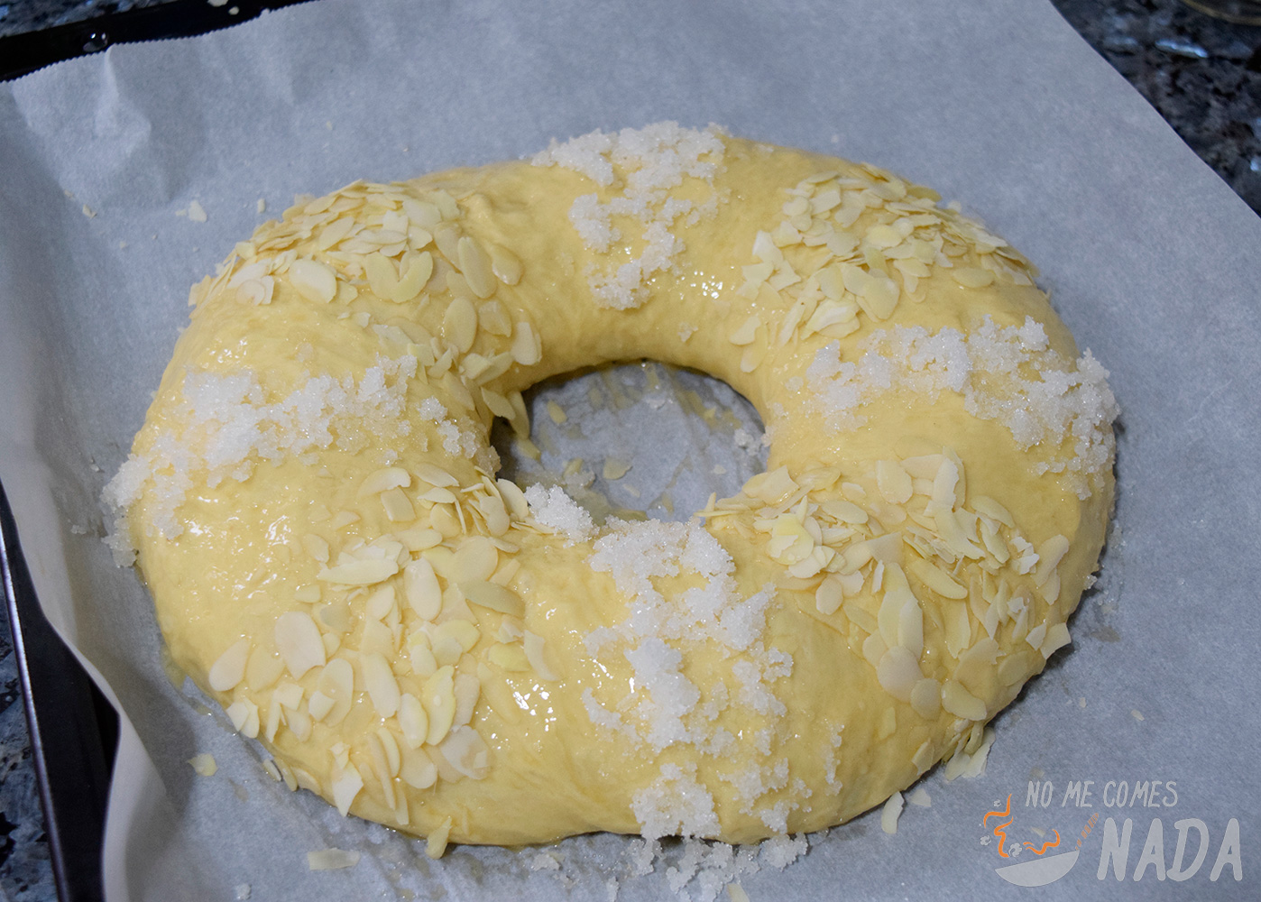 Tras la segunda fermentación, volvemos a pintar muy bien con huevo y decoramos al gusto (en mi caso almendras laminadas y azúcar mojada en agua de azahar). Metemos al horno precalentado a 190ºC durante unos 25-30 minutos. Como siempre, cada horno es un mundo, vigilad que no se os queme.