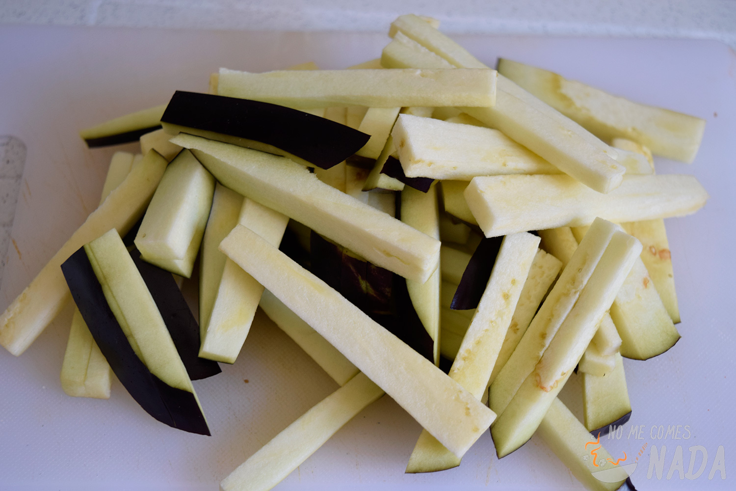 Lavamos bien la berenjena puesto que no le quitaremos la piel. La cortamos en bastoncitos, como si estuviéramos cortando patatas.