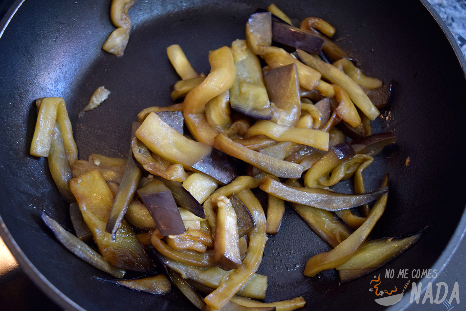 Ponemos una sartén con un chorrito de aceite a fuego medio y, cuando esté caliente, echamos la berenjena troceada. Cuando veamos que la berenjena está blanda, añadimos un chorro generoso de salsa de soja y salteamos unos minutos para que se impregne bien del sabor.