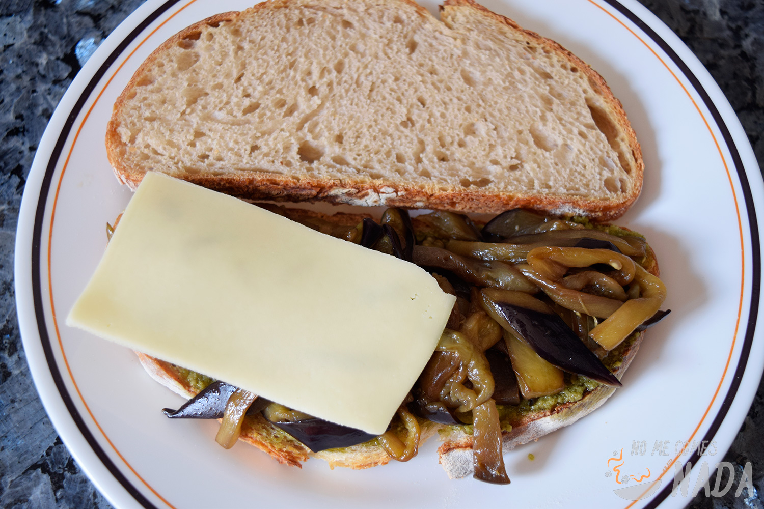 Como esta es la única preparación que tenemos que hacer, ya solo nos queda montar el sándwich, que lo haríamos de la siguiente manera: rebanada de pan, untamos con salsa pesto, berenjenas y lonchas de queso, dejándolo sin terminar aún.