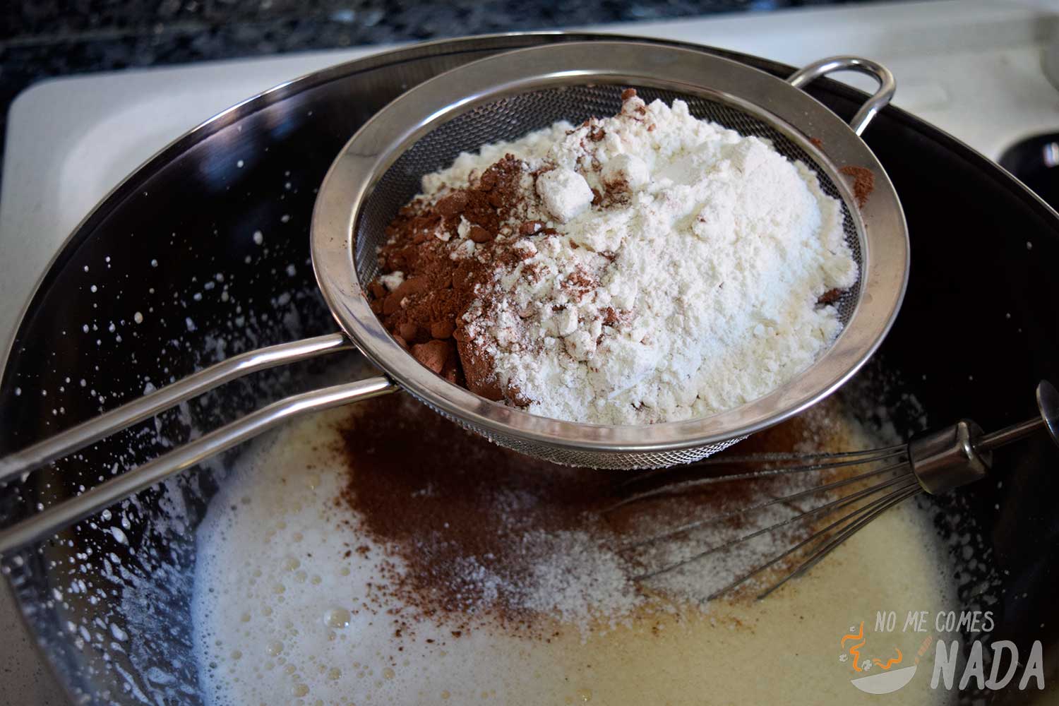 Ahora vamos con los ingredientes “secos”. Incorporaremos la harina, el cacao y la levadura todo junto, tamizándolo previamente para evitar que se formen grumos. Batimos hasta obtener una mezcla homogénea. Añadimos una pizca de sal y removemos ligeramente para que se reparta por la mezcla.