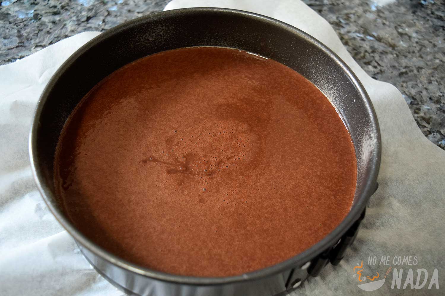 Por último, añadiremos el agua caliente y volveremos a batir hasta obtener una mezcla homogénea. Vertemos en el molde, que habremos engrasado ligeramente para facilitar el desmoldado y que no se pegue el bizcocho.