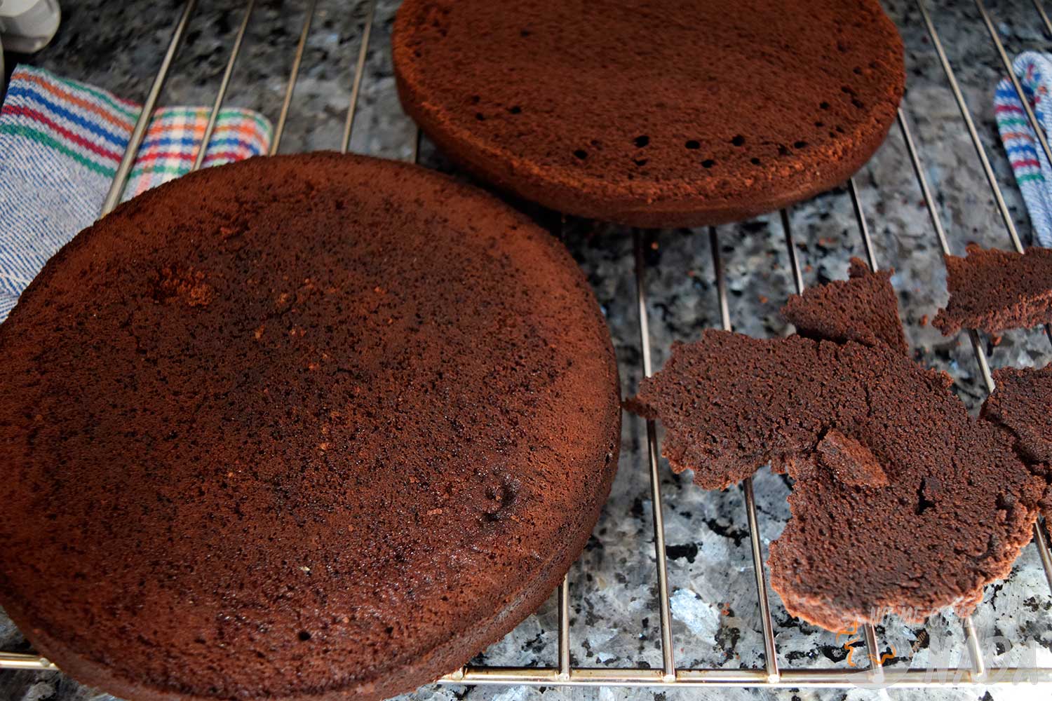 Sacamos del horno y dejamos enfriar, sin desmoldar, sobre una rejilla durante unos 10 minutos para que el bizcocho se asiente. Desmoldamos y procedemos a hacer los cortes al bizcocho. Por un lado, quitaremos el sobrante superior (el “copete” que le sale al bizcocho) para alisar la superficie. Por otro lado, cortaremos el bizcocho por la mitad para hacer 2 capas. Dejamos enfriar totalmente las 2 capas sobre la rejilla.