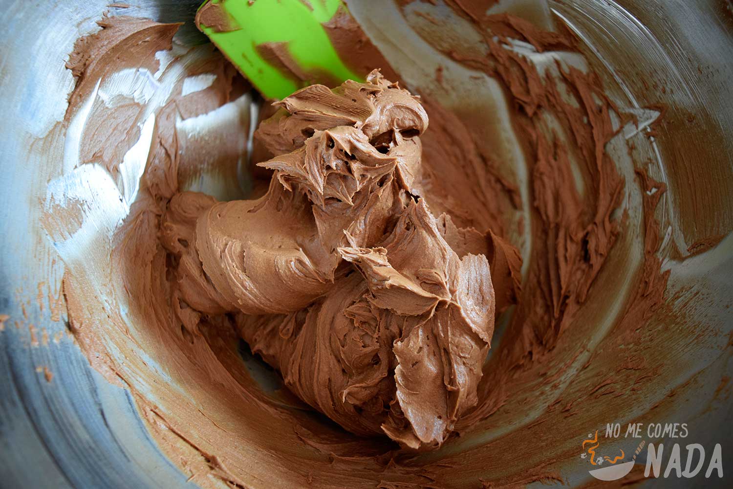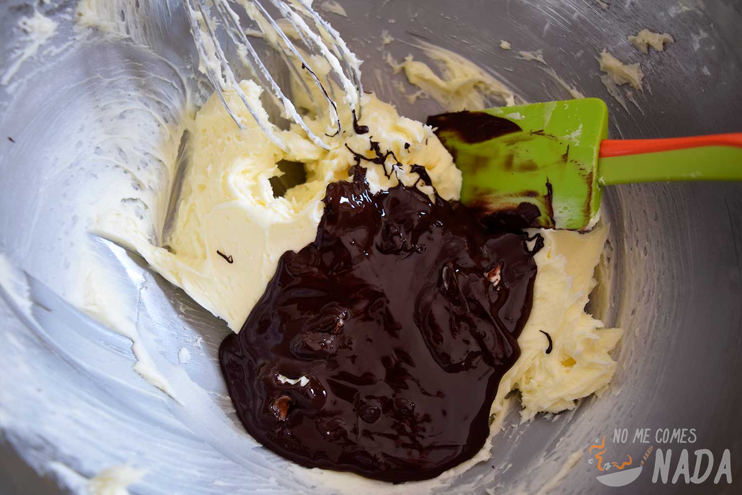 Añadimos el chocolate (que ya debería haberse enfriado) y batimos el tiempo justo para que esté totalmente integrado en la buttercream.