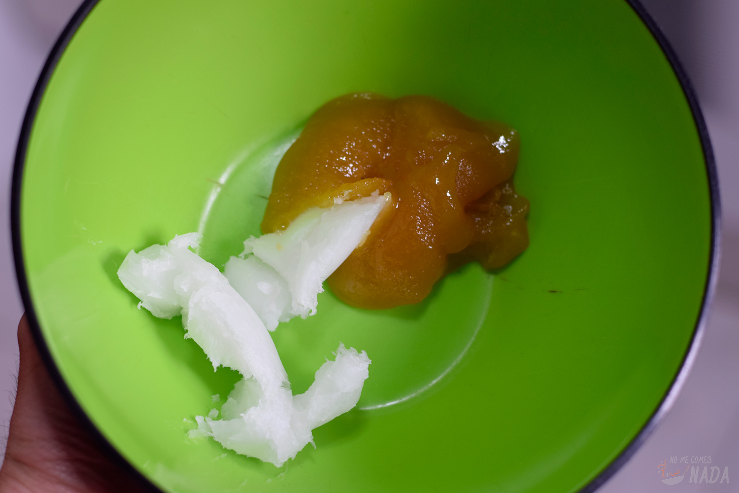 En un bol ponemos el aceite de coco junto con la miel y los derretimos al microondas, poniéndolos en intervalos de pocos segundos hasta que se derritan (sin llegar a coger mucha temperatura).