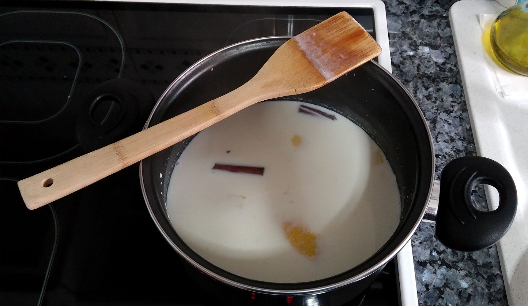 En un cazo se vierte la leche y se le añade la rama de canela, la cáscara de limón y azúcar, se lleva a ebullición y se deja enfriar. Con esto lo que queremos conseguir es que la leche coja el sabor del limón y la canela. Adicionalmente, se le puede echar un poco de azúcar, en función de si os gusta más o menos el dulce.
