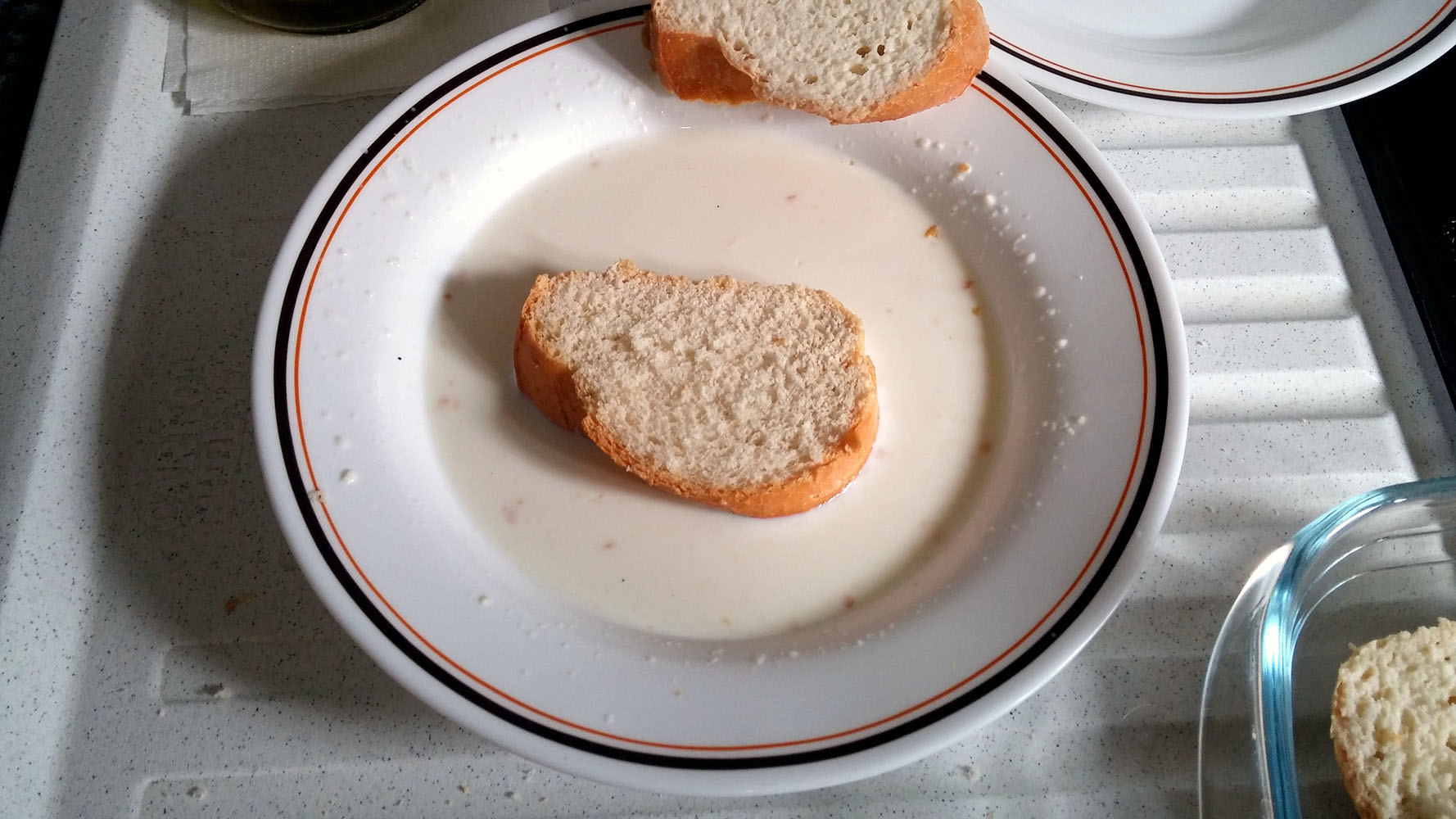 Se corta el pan en rebanadas más bien gordas (un poco más anchas que un dedo) y se empapan en la leche que hemos preparado previamente. Aquí es donde reside la «dificultad» de la receta, ya que tienen que quedar suficientemente jugosas pero no pasarse pues se romperán y quedarán muy babosas. Las vamos dejando en una fuente para que suelten el exceso de leche.