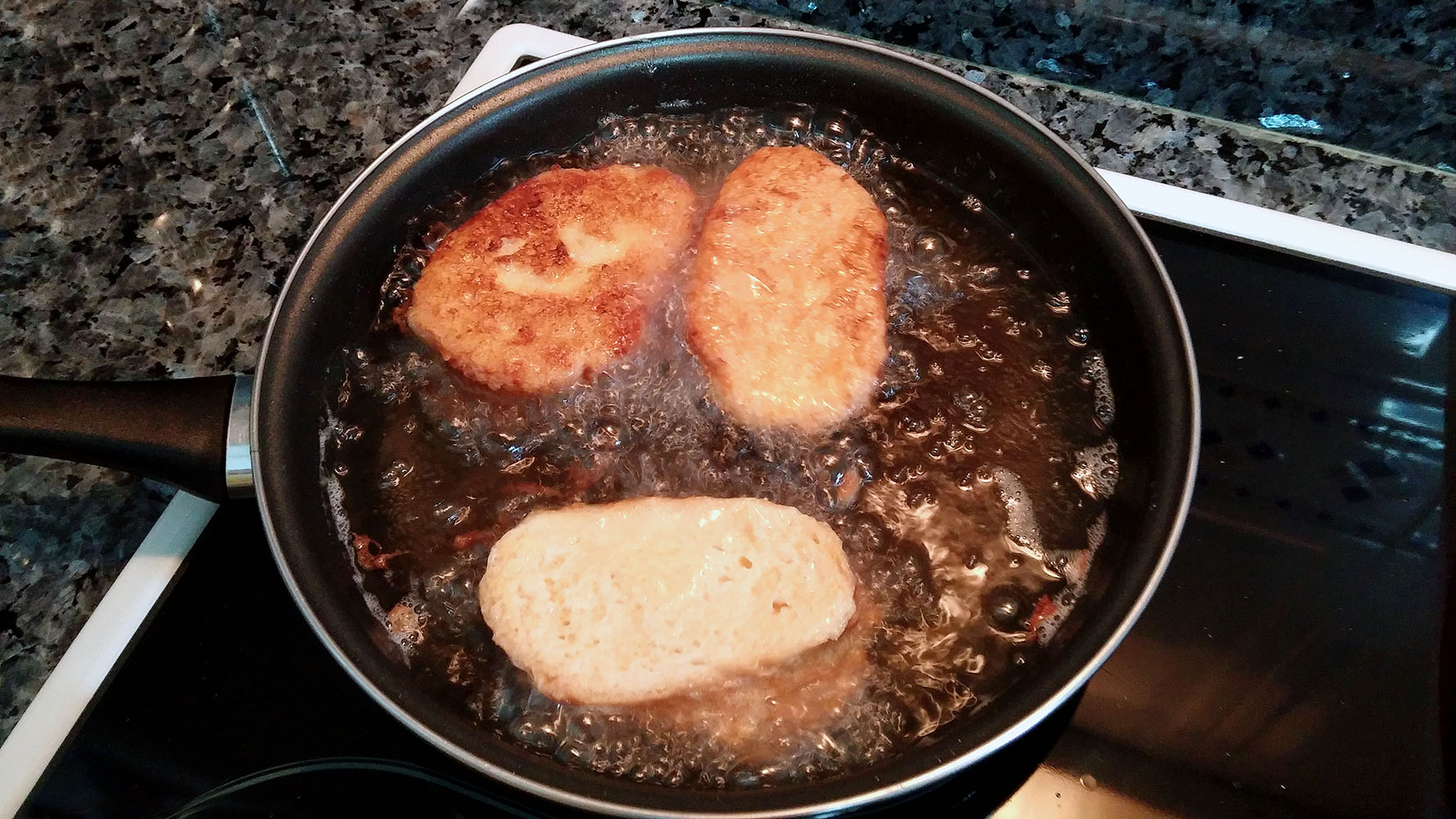Ponemos a calentar aceite en una sartén y cuando este esté muy caliente (esto es muy importante) se cogen las rebanadas, se pasan por huevo batido muy rápidamente y se echan a la sartén dejando que se doren por ambos lados.