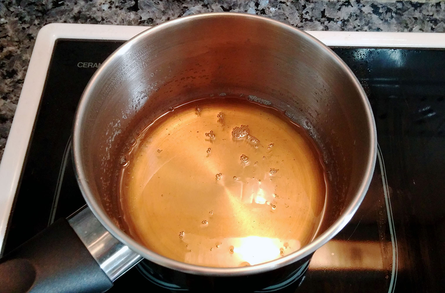 Para el baño de miel ponemos un cazo al fuego con miel rebajada con agua y calentamos hasta que se homogenice, la proporción ha sido 100% a ojo, pero si miráis la literatura recomiendan una proporción de dos tercios de miel y uno de agua. Una vez el baño está preparado se vierte sobre las torrijas.