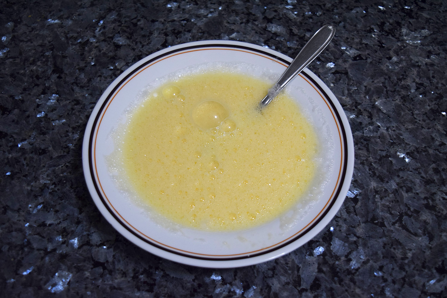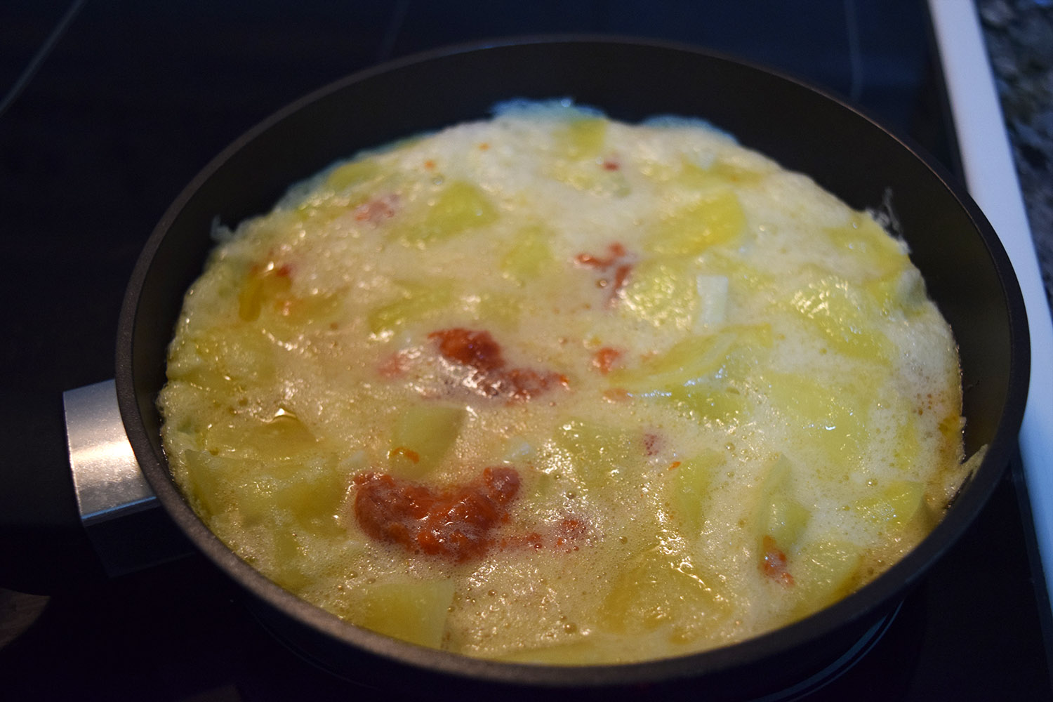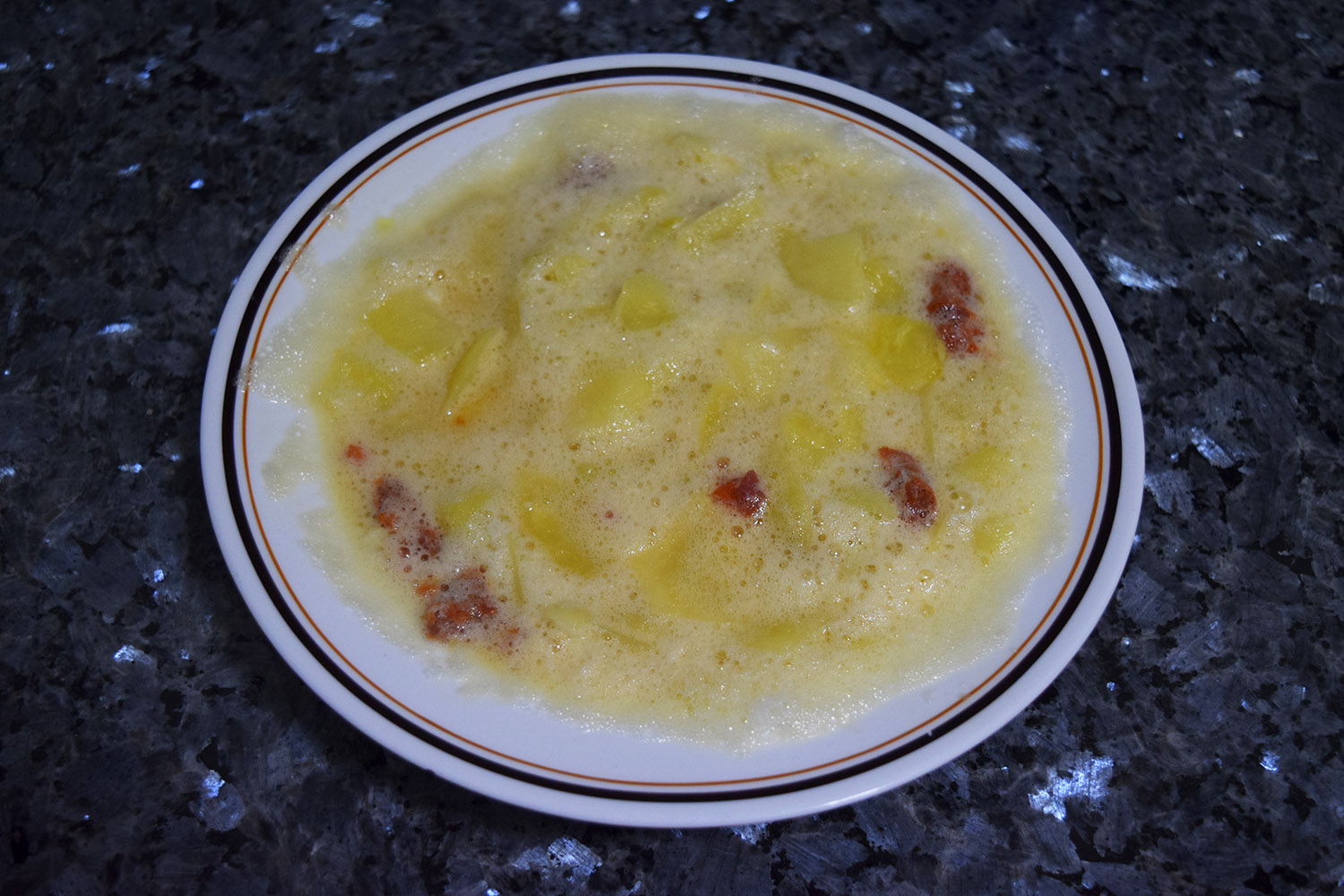 Una vez tengamos las claras separadas, con un tenedor empezamos a batir hasta que tengamos las claras casi a punto de nieve. Hay que batir enérgicamente, que os duela el brazo Mis amigos siempre se meten conmigo porque dicen que parece que voy a hacer merengue en vez de una tortilla. Con las claras batidas, echamos las yemas y batimos para mezclarlo todo. En este punto acordaros de echar sal a los huevos, que a mí siempre se me olvida y luego me queda sosa… Incorporamos las patatas y si vais a hacer la tortilla con algún ingrediente extra (la de la foto tiene chorizo y queso) lo incorporamos también.