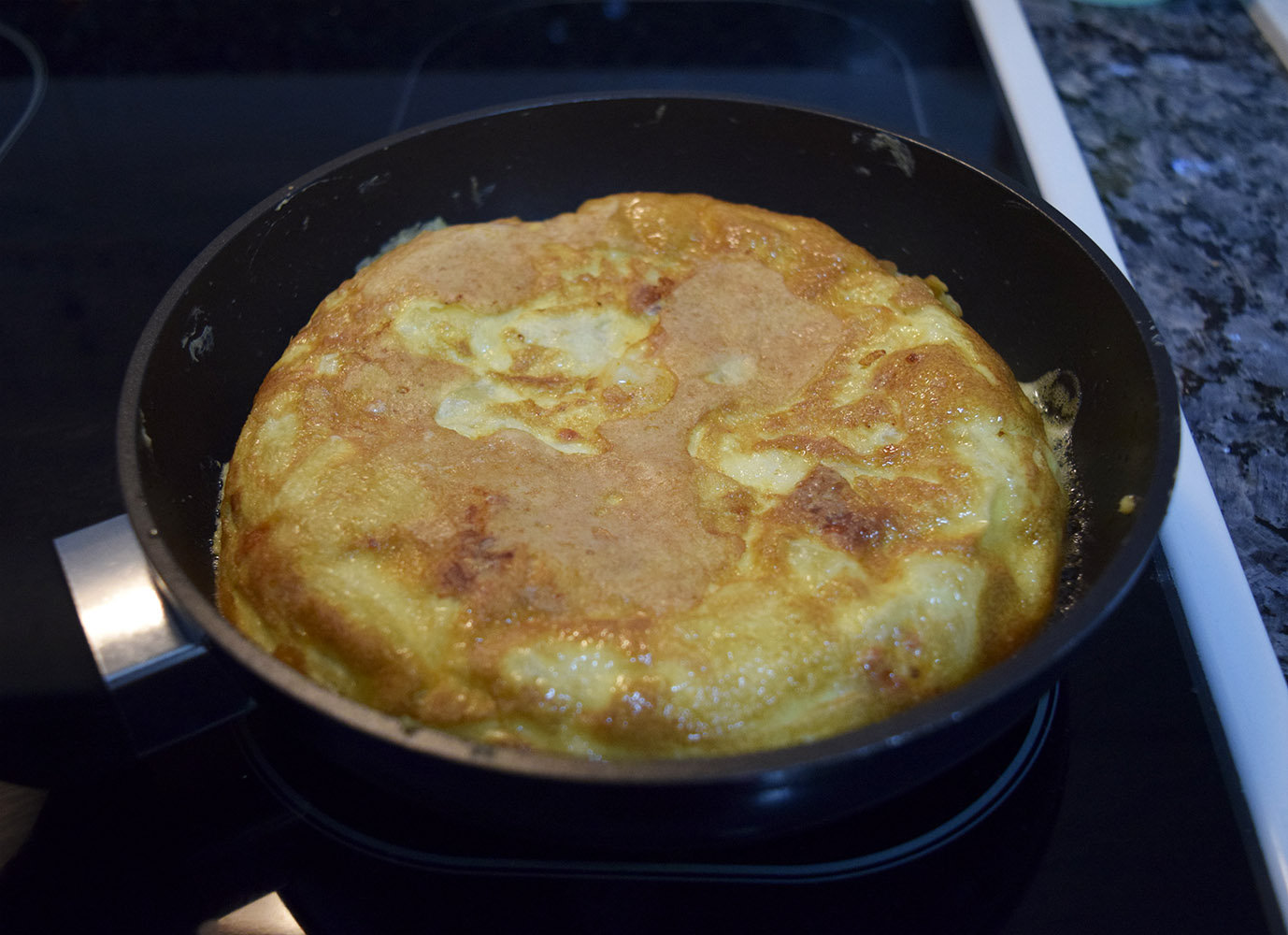 De vez en cuando le damos un “meneo” fuerte a la sartén para comprobar si ya está hecha por abajo y si se despega bien del fondo, está lista para darle la vuelta. Cogemos un plato llano para tapar la sartén y con un giro rápido le damos la vuelta a la tortilla. Hacedlo sin miedo, que tapando firmemente la sartén no se sale nada Echamos otro chorrito de aceite en la sartén y volvemos a echar la tortilla para que se haga por el otro lado. Al igual que antes, dejamos hasta que veamos que se despega del fondo.