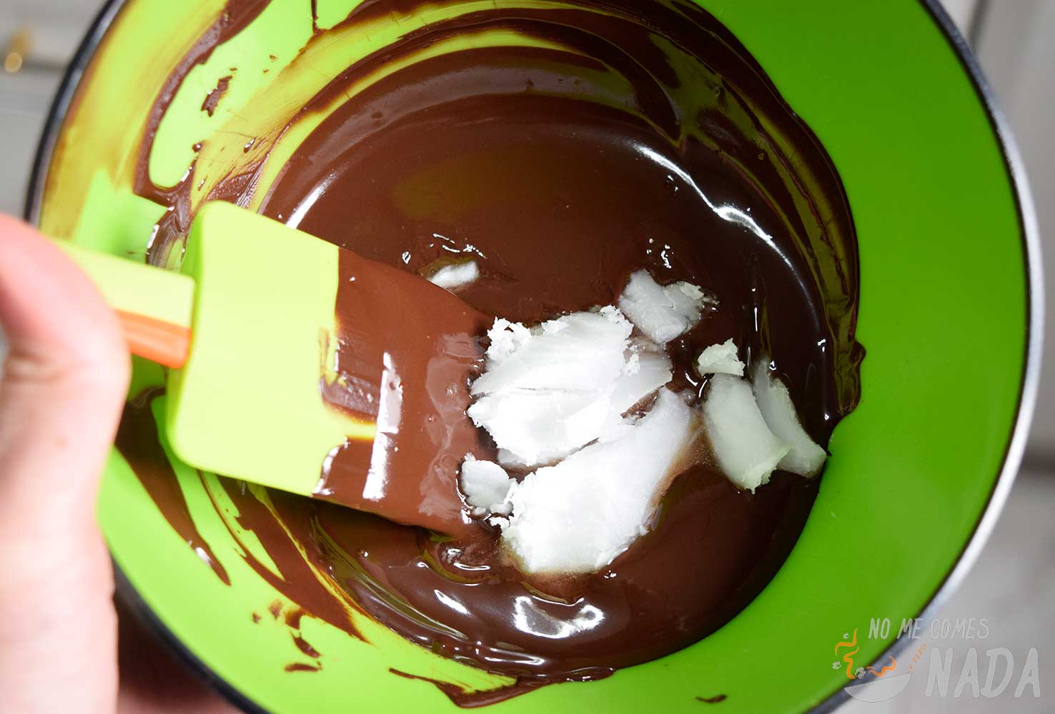 Cuando esté totalmente derretido, añadimos el aceite vegetal y mezclamos hasta integrarlo totalmente. En mi caso, al usar aceite de coco, lo tuve que poner otro poco en el microondas para que se derritiera el mismo.