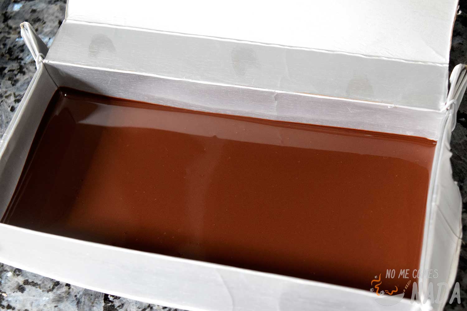 En el recipiente que hayamos elegido para preparar el turrón de chocolate crujiente (yo hice este molde con un brick de leche), vertemos una fina capa de chocolate y lo metemos al frigorífico para que se endurezca. Así conseguiremos una capa superior totalmente lisa.