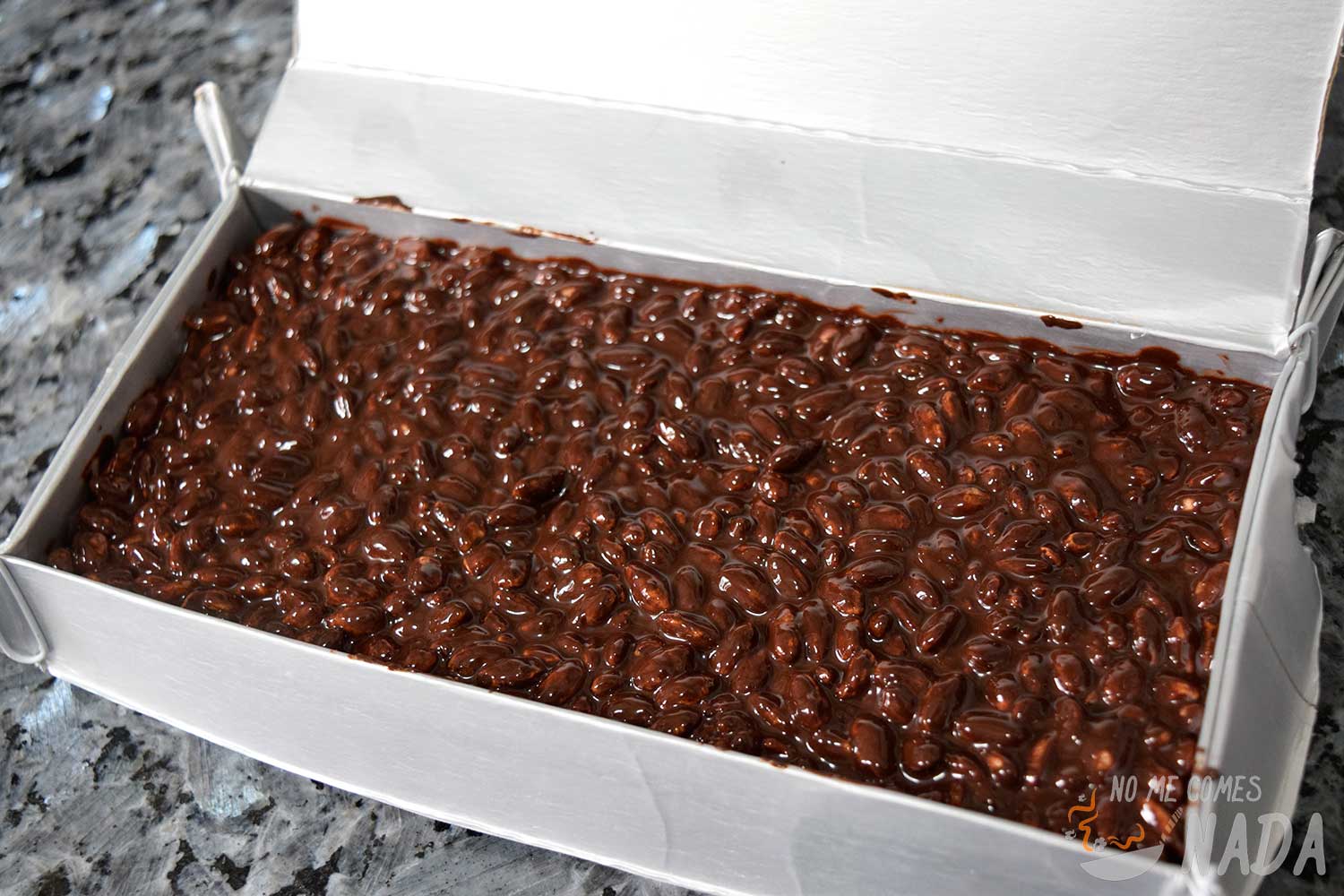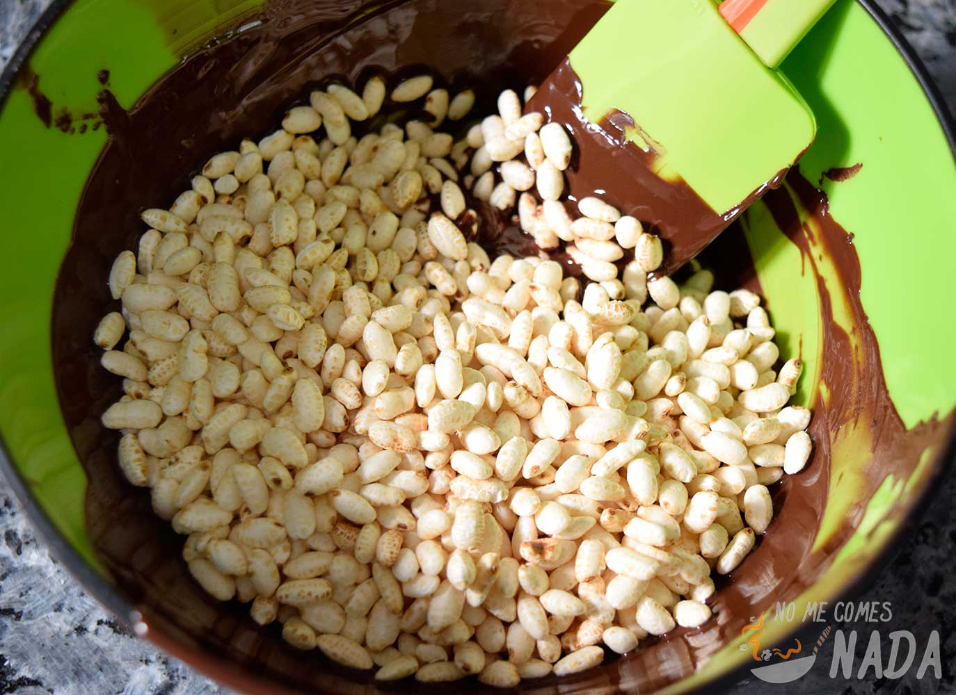Vertemos el arroz hinchado en el bol y mezclamos para que todos los copos se impregnen bien de chocolate. Cuando la capa que tenemos en el molde haya endurecido (no necesita ni 5 minutos), vertemos toda la mezcla en el molde, repartiéndola por toda la superficie para que quede igualada.