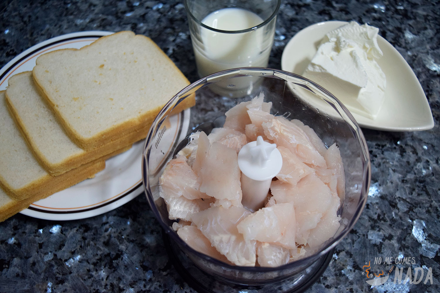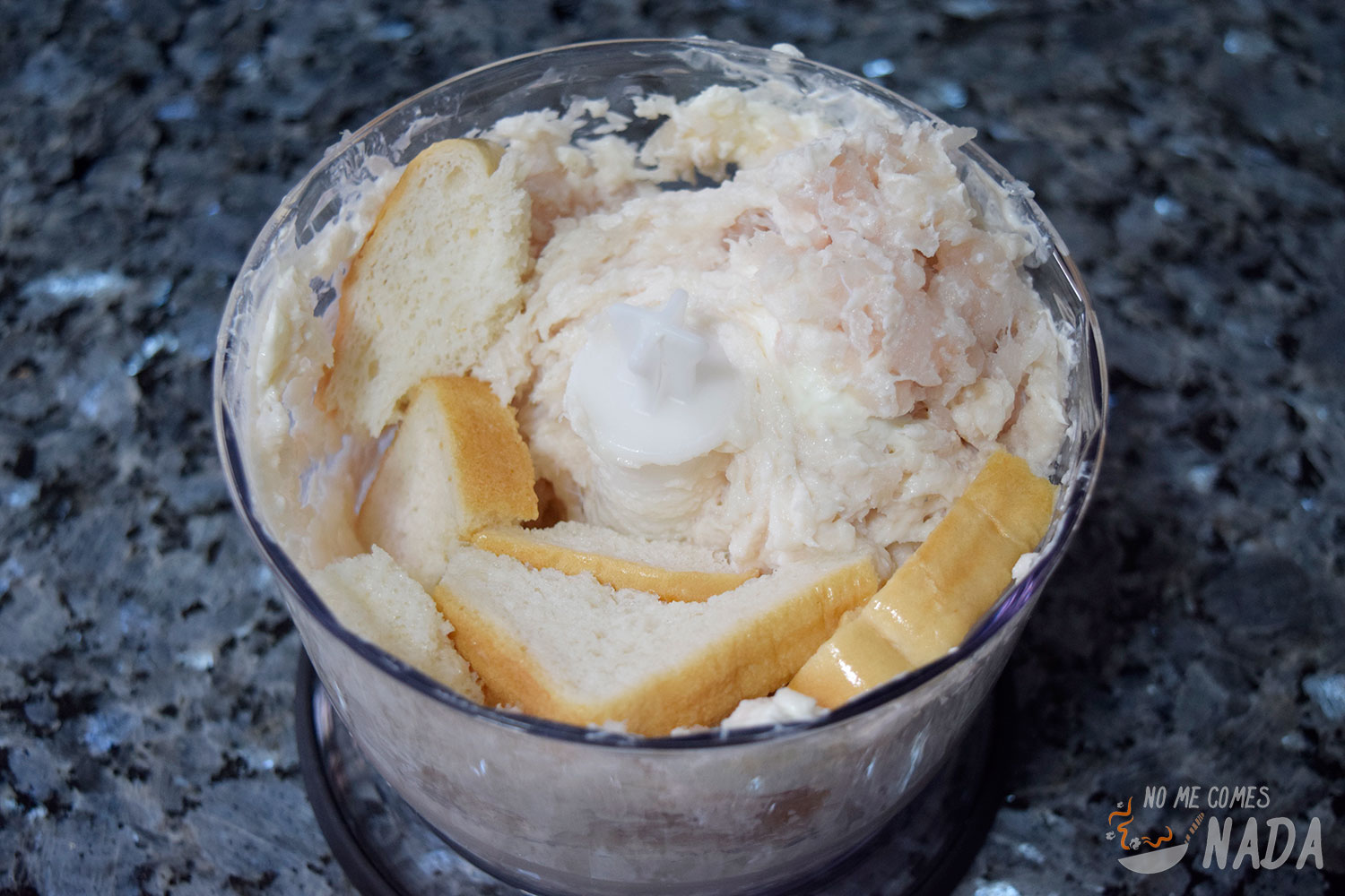 Ponemos la leche en un plato y mojamos el pan para después incorporarlo junto con el resto de ingredientes. De nuevo, ponemos a toda máquina nuestra picadora/robot de cocina hasta tener una pasta homogénea.