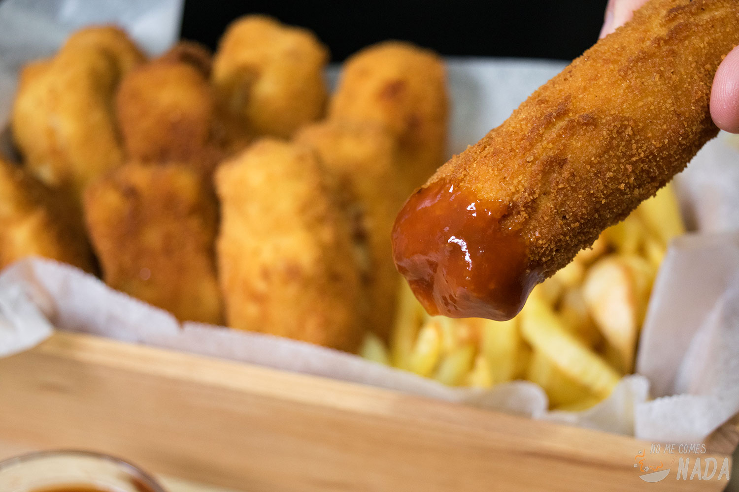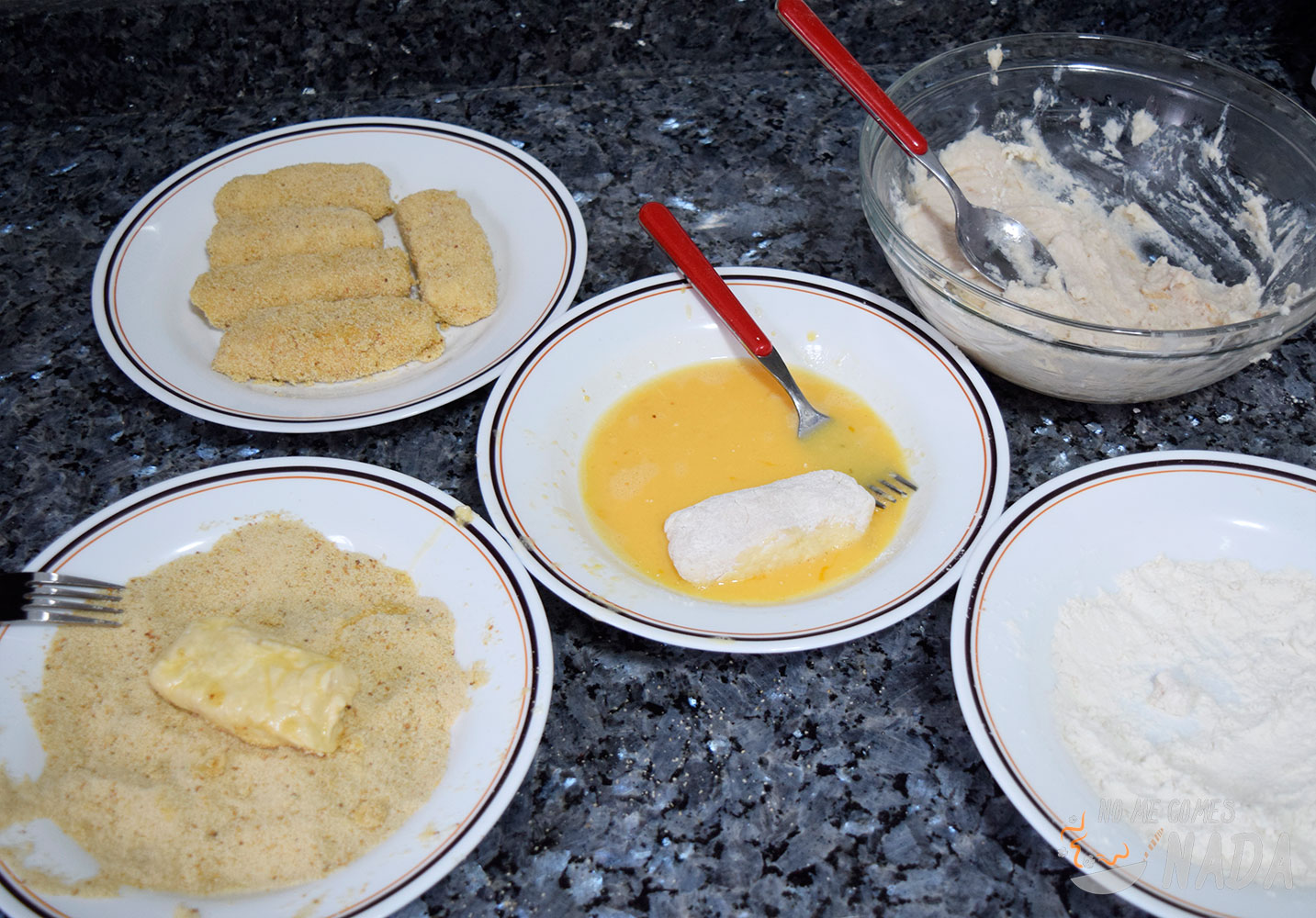 Con la masa lista, vamos con el rebozado. Simplemente cogemos una porción de masa a la que daremos forma de varita y la pasamos por harina, huevo batido y pan rallado para rebozarla. Si veis las fotos, a mí me quedaron unas varitas de tamaño considerable porque eran más fáciles de manejar, pero podéis hacerlas del tamaño y/o forma que queráis.