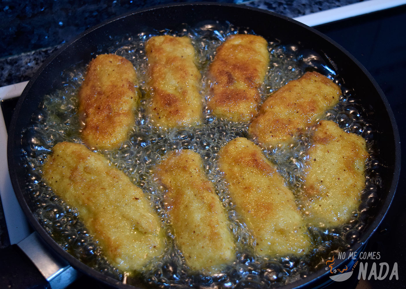En una sartén, echamos un dedo de aceite de oliva suave, la dejamos a fuego fuerte hasta que esté bien caliente y a freír. Freímos las varitas unos minutos por cada lado hasta que esté bien doraditas y, al sacarlas, las colocamos sobre papel de cocina absorbente para que suelten el exceso de aceite que tengan.